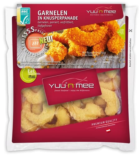 Der österreichische Seafood-Experte Yuu'n Mee steht für den natürlichen, unverfälscht klaren Geschmack nachhaltig gezüchteter Garnelen in herausragender Produktqualität. Yuu'n Mee Garnelen in Knusperpande stammen aus nachhaltiger Aufzucht in Vietnam und sind 100% kontrolliert frei von Antibiotika. Die saftigen Garnelen sind umhüllt von einer besonders knusprigen Bröselpanade und gelingen mühelos einfach im Backofen. Goldbraun schmecken sie unwiederstehlich gut zu einem Dip. Der perfekte Snack für zwischendurch oder als Party-Fingerfood. Auch Kindern schmecken Yuu'n Mee Garnelen in Knusperpanade.
