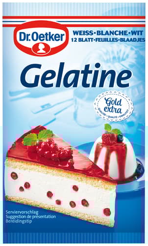 Durch das Blattformat lässt sich das Geliermittel gut portionieren und verspricht Gelinggarantie in allen Verwendungsmöglichkeiten. Eine Packung Blatt Gelatine weiß ist ausreichend für 500 ml Flüssigkeit und entspricht einem Päckchen Dr. Oetker Gelatine gemahlen weiß.