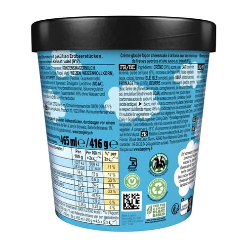 Erdbeer-Käsekuchen-Eiscreme mit gesüßten Erdbeerstücken und Keksstrudel (9%).