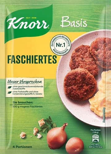 Zubereitung: Was Sie dazu brauchen: 500 g mageres Faschiertes und 2 EL Öl 1) Beutelinhalt mit gut 150 ml kaltem Wasser verrühren und 3 Minuten stehen lassen. Masse gründlich mit dem Faschierten vermengen. 2) Die faschierte Speise wie gewohnt zubereiten, z.B. 8 faschierte Laibchen formen und in heißem Öl ca 5 Minuten auf beiden Seiten braten.