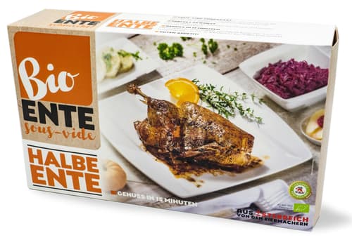 Die bei 60-70°C Sous Vide vorgegarte halbe Bio-Ente ist das optimale Gericht für jeden Anlass. Geschmacklich perfekt abgestimmt und schnell zubereitet und wunderbar zart ist sie optimal für festliche Anlässe, aber auch als guter Sonntagsbraten. Bestes Futter, regionale Aufzucht, artgerechte Freiland-Haltung der Tiere, sowie ein schonender, professioneller Umgang bei Verarbeitung und Verpackung sind für uns die wesentlichen Grundsätze für die einzigartige Qualität unserer Produkte.
