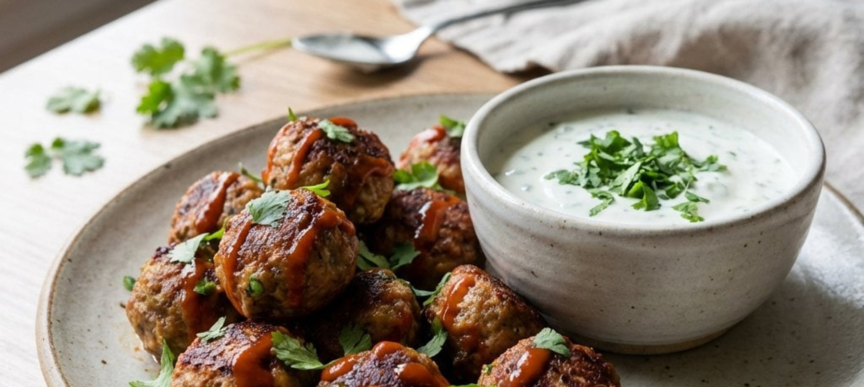 Serviere die Fleischbällchen am besten mit frischem Fladenbrot oder Jasminreis für eine vollwertige Mahlzeit. Ein Spritzer Limette über dem Dip sorgt für zusätzliche Frische!