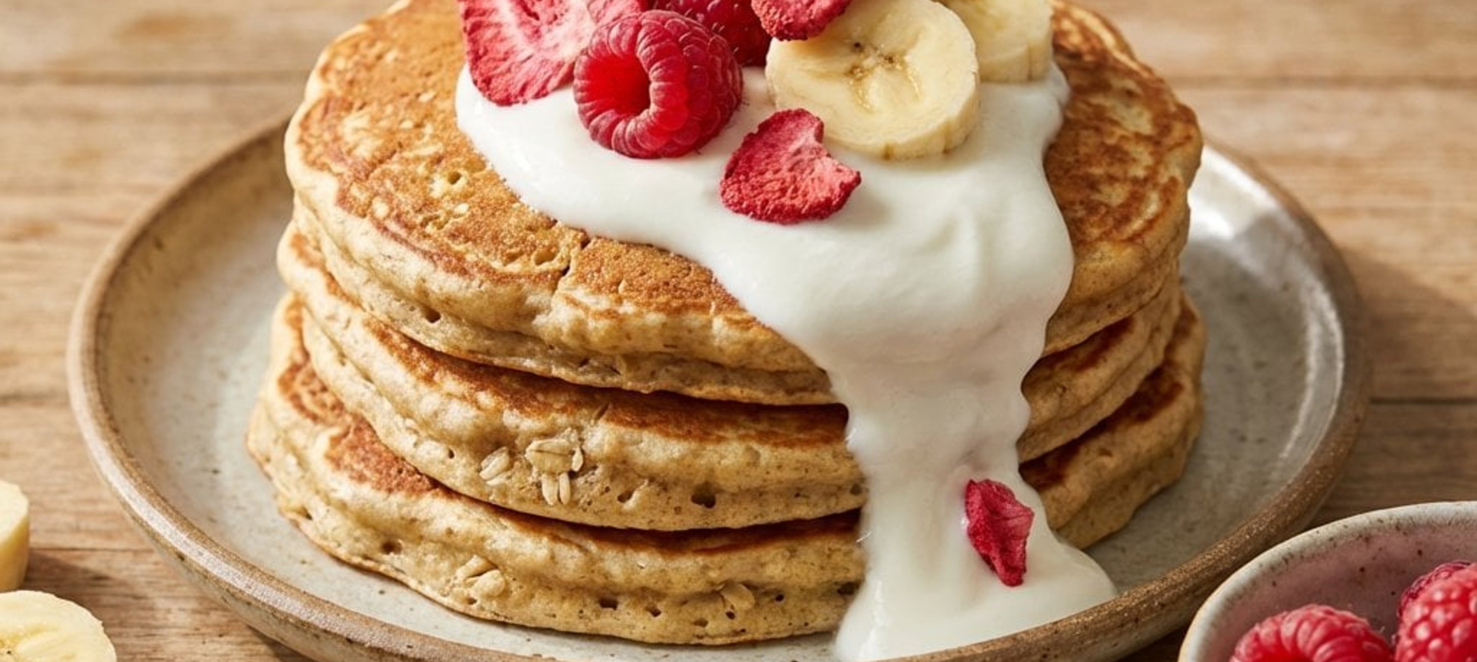- 3Die Pancakes warm mit frischen Beeren und einem Klecks Naturjoghurt servieren. Mit Ahornsirup beträufeln, leicht mit Staubzucker bestreuen und mit frischen Minzblättern garnieren.