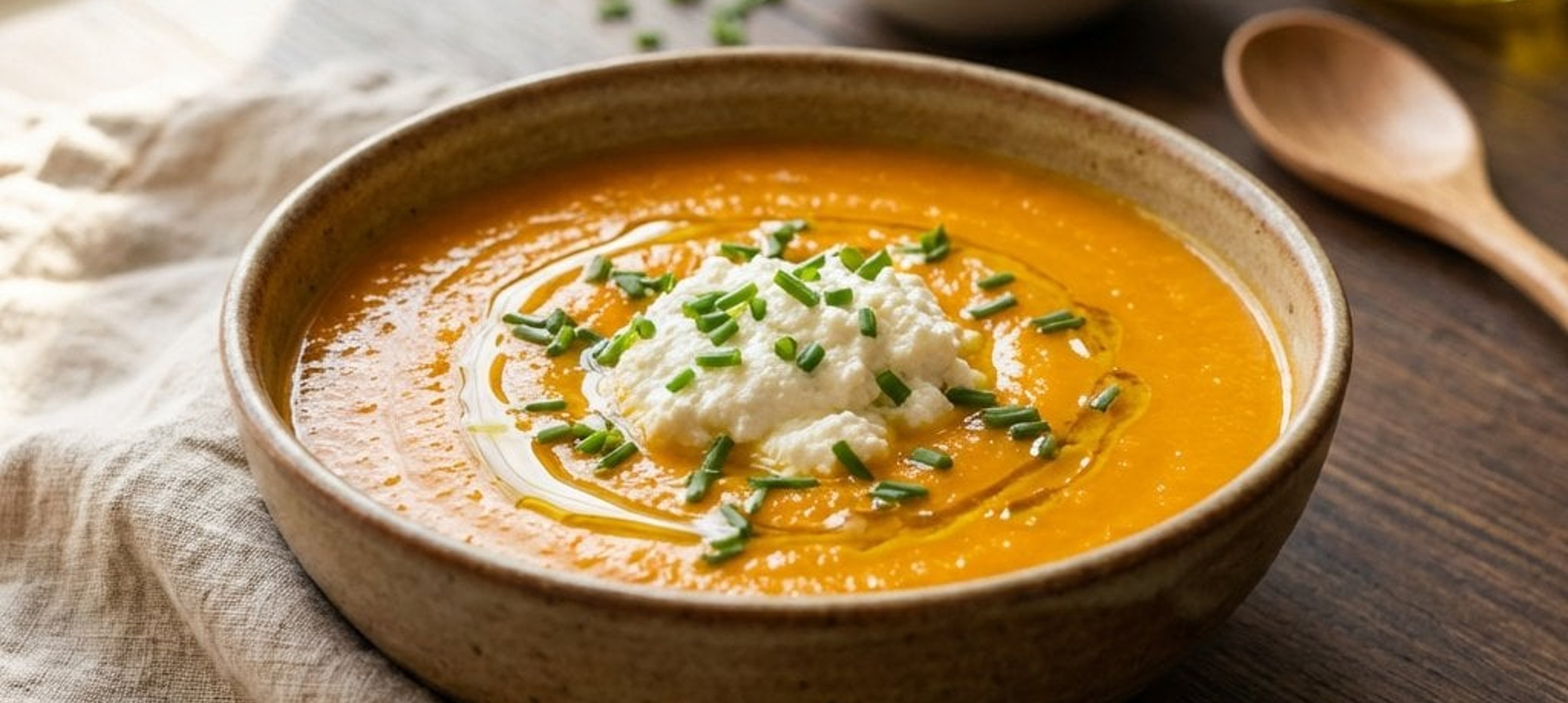 - 5Die Suppe in Teller füllen, jeweils einen Klecks Ricotta in die Mitte setzen, mit fein geschnittenem Schnittlauch und frisch gemahlenem Pfeffer bestreuen und mit dem restlichen Olivenöl beträufeln.