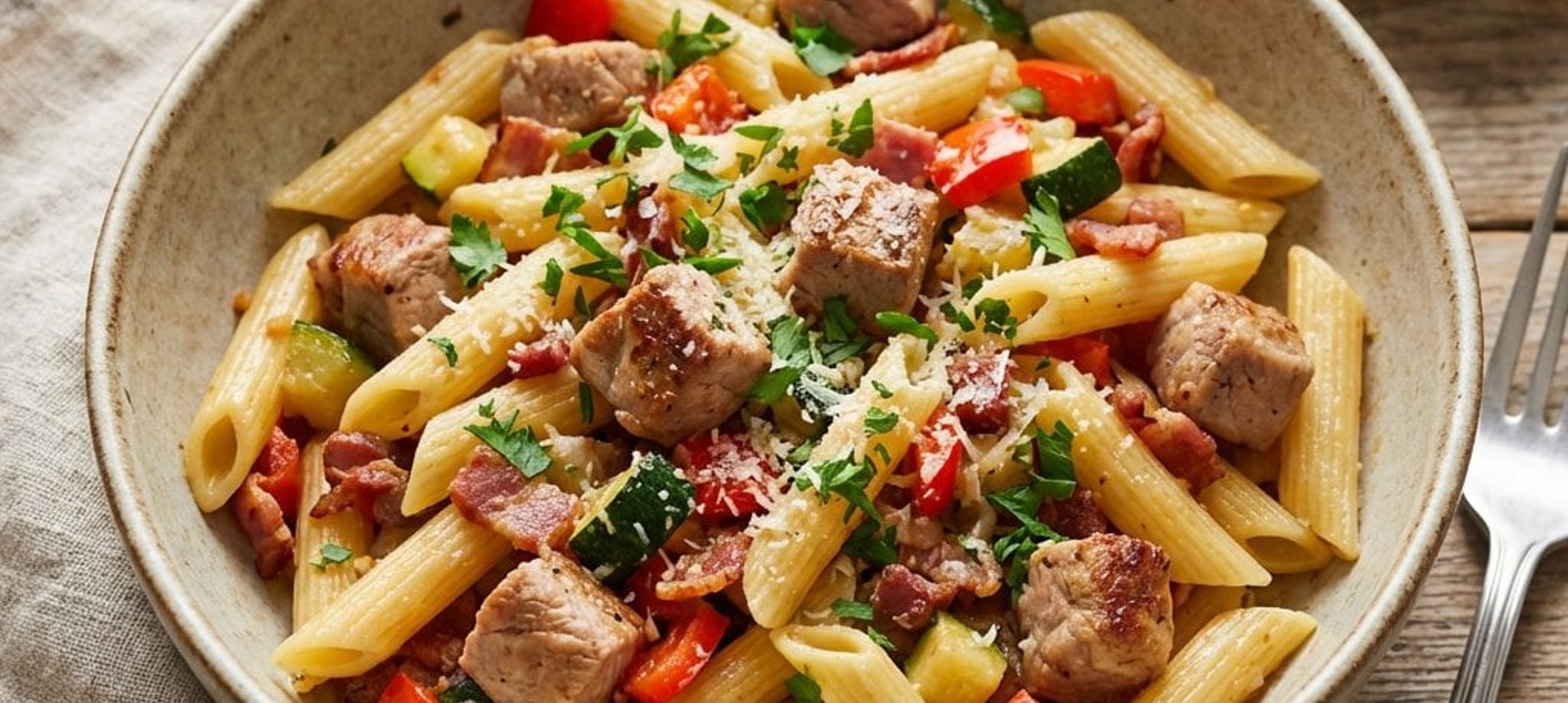 Ein kleiner Tipp: Das Nudelwasser ist das Geheimnis für die perfekte Bindung der Sauce. Es enthält Stärke, die das Fleisch und Gemüse wunderbar mit den Penne verbindet. Guten Appetit!