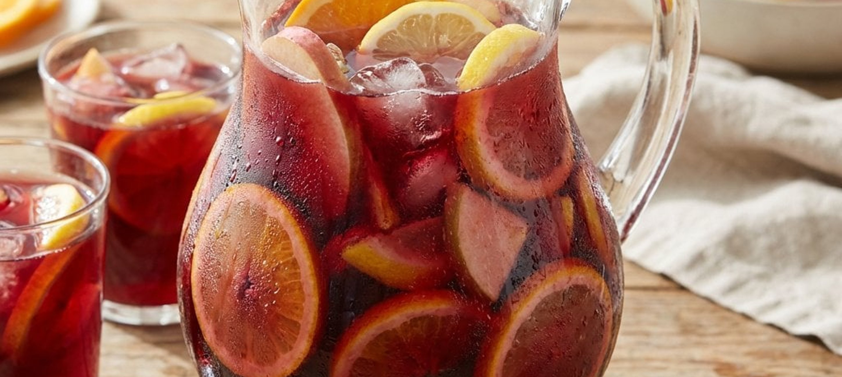 Servieren Sie die Sangria in großen Weingläsern und achten Sie darauf, dass jeder Gast auch ein paar der marinierten Fruchtstücke ins Glas bekommt – sie sind das Beste daran!