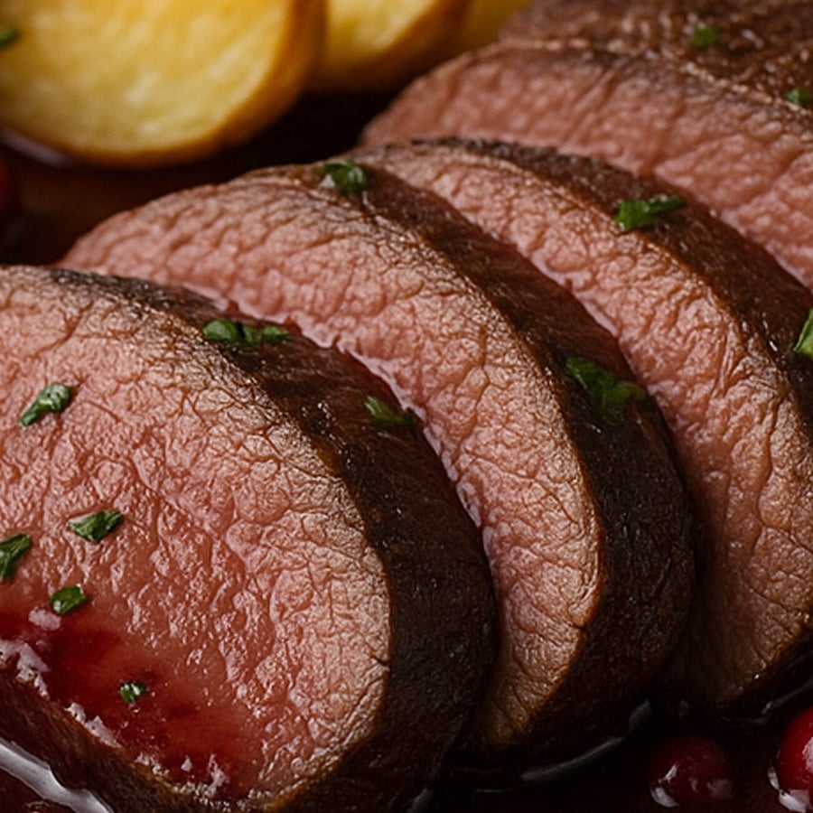 - 11Keule gegen die Faser in Scheiben schneiden. Mit der Preiselbeer-Rotwein-Soße servieren.