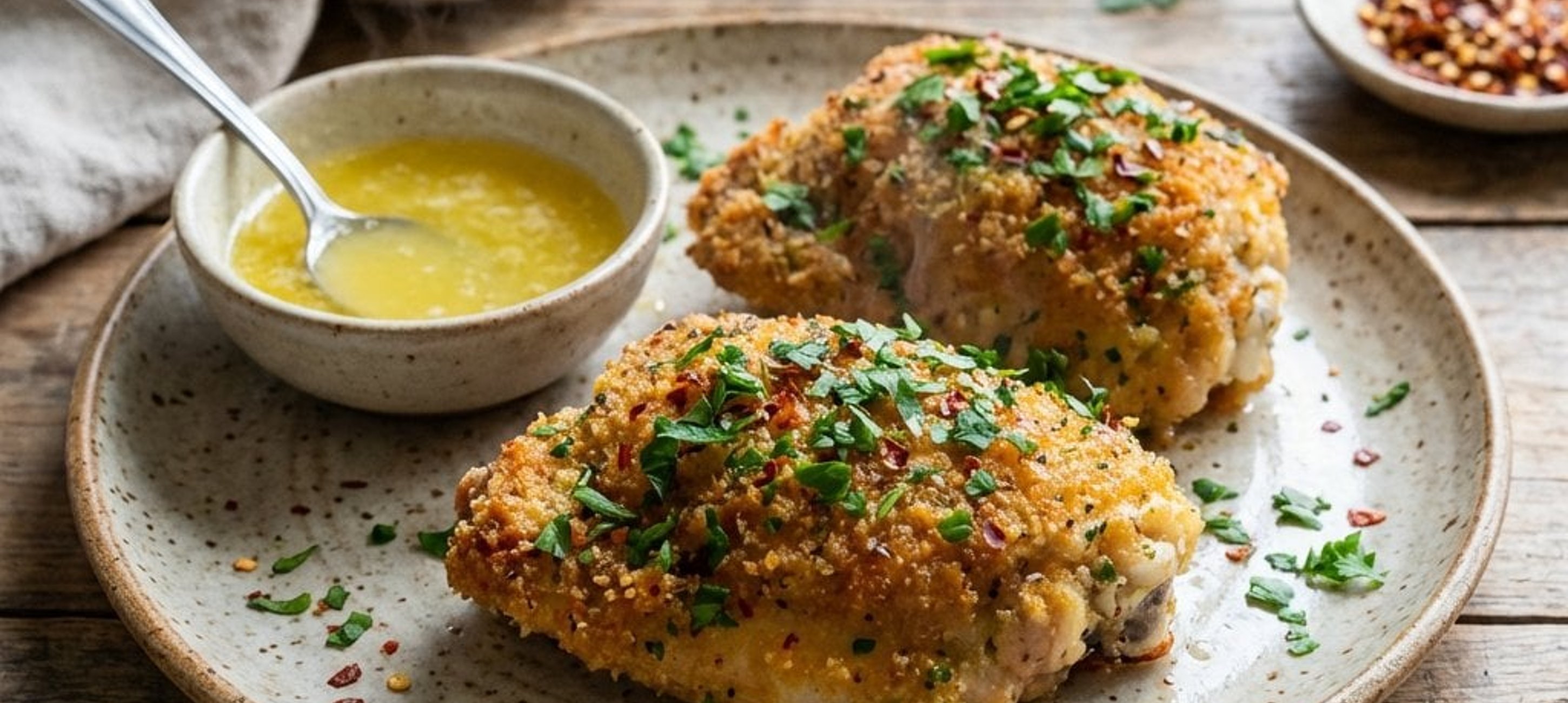 - 7Vom Herd nehmen, das Fleisch mit der Hautseite nach oben in eine Auflaufform legen und mit einer dünnen Schicht der restlichen Panier bestreuen. Im vorgeheizten Ofen ca. 10 Minuten fertig garen.