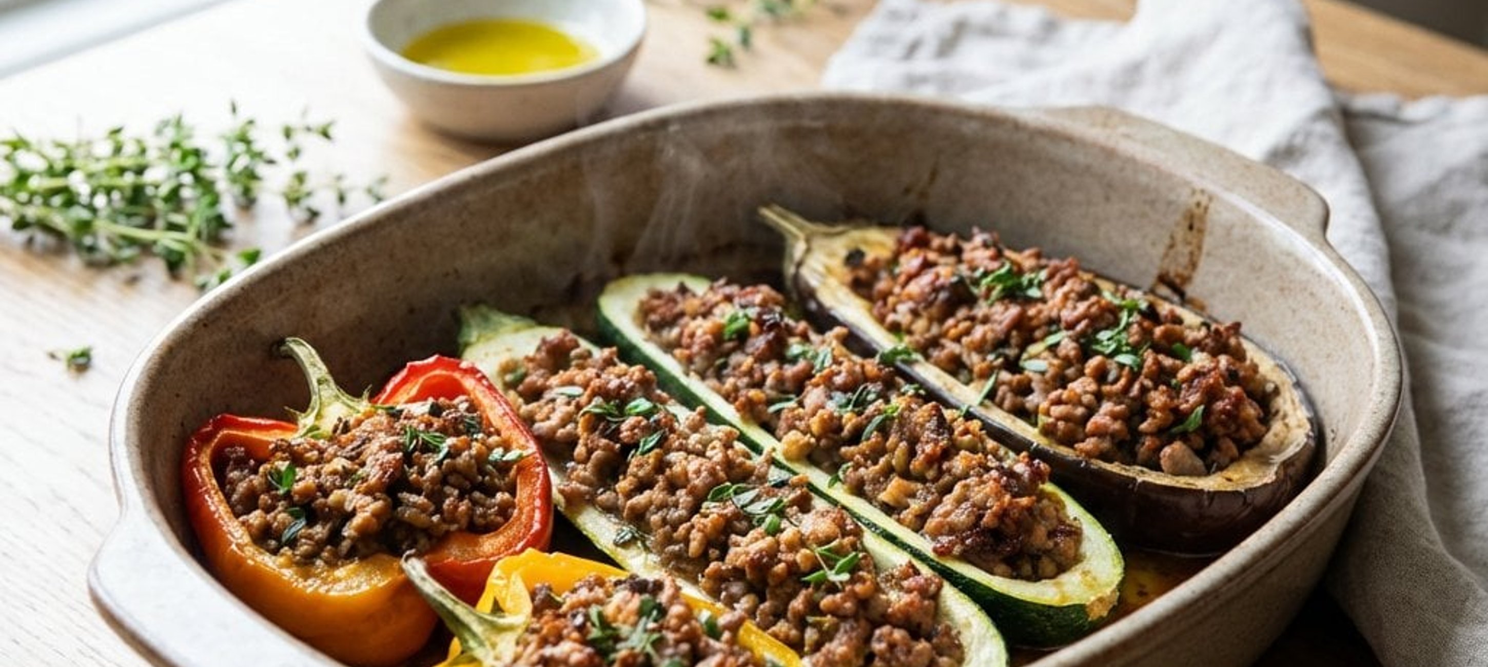 - 5Die restlichen Dosentomaten in einer Auflaufform verteilen. Das vorbereitete Gemüse darauf platzieren und großzügig mit der Fleischmischung füllen. Mit den restlichen Kräutern bestreuen und mit dem restlichen Olivenöl beträufeln.