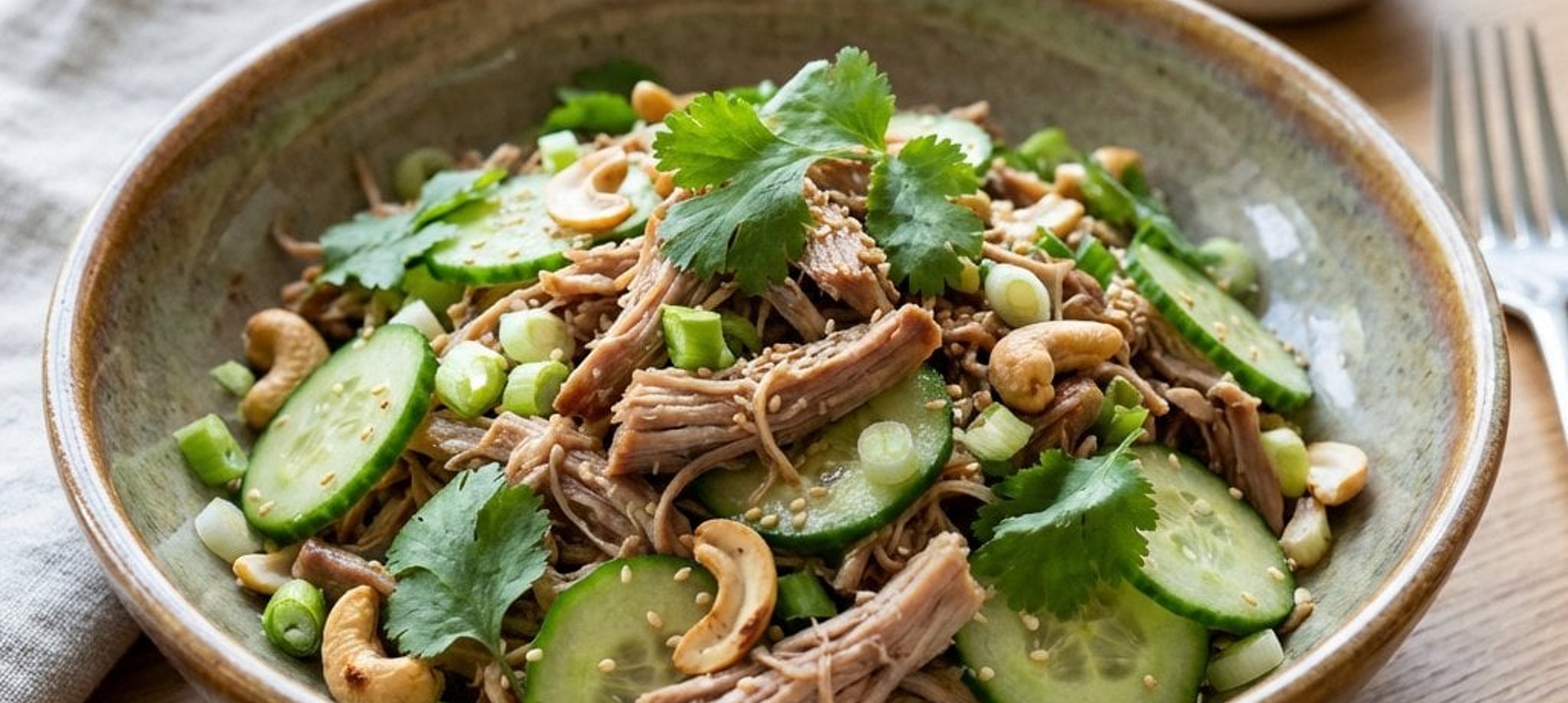 - 4In einer großen Schüssel die Gurken, Jungzwiebeln, gerösteten Cashews, Sesam, Koriander, Minze und nach Belieben die Chili vermengen. Mit Sesamöl, Limettensaft sowie dem restlichen Salz und Pfeffer abschmecken.