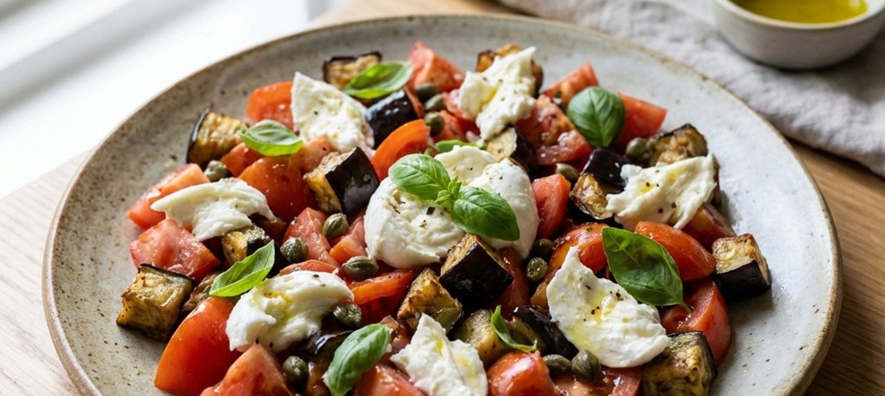 Der Salat schmeckt besonders gut, wenn er 10 Minuten ziehen kann, damit sich die Aromen von Essig und Basilikum voll entfalten.