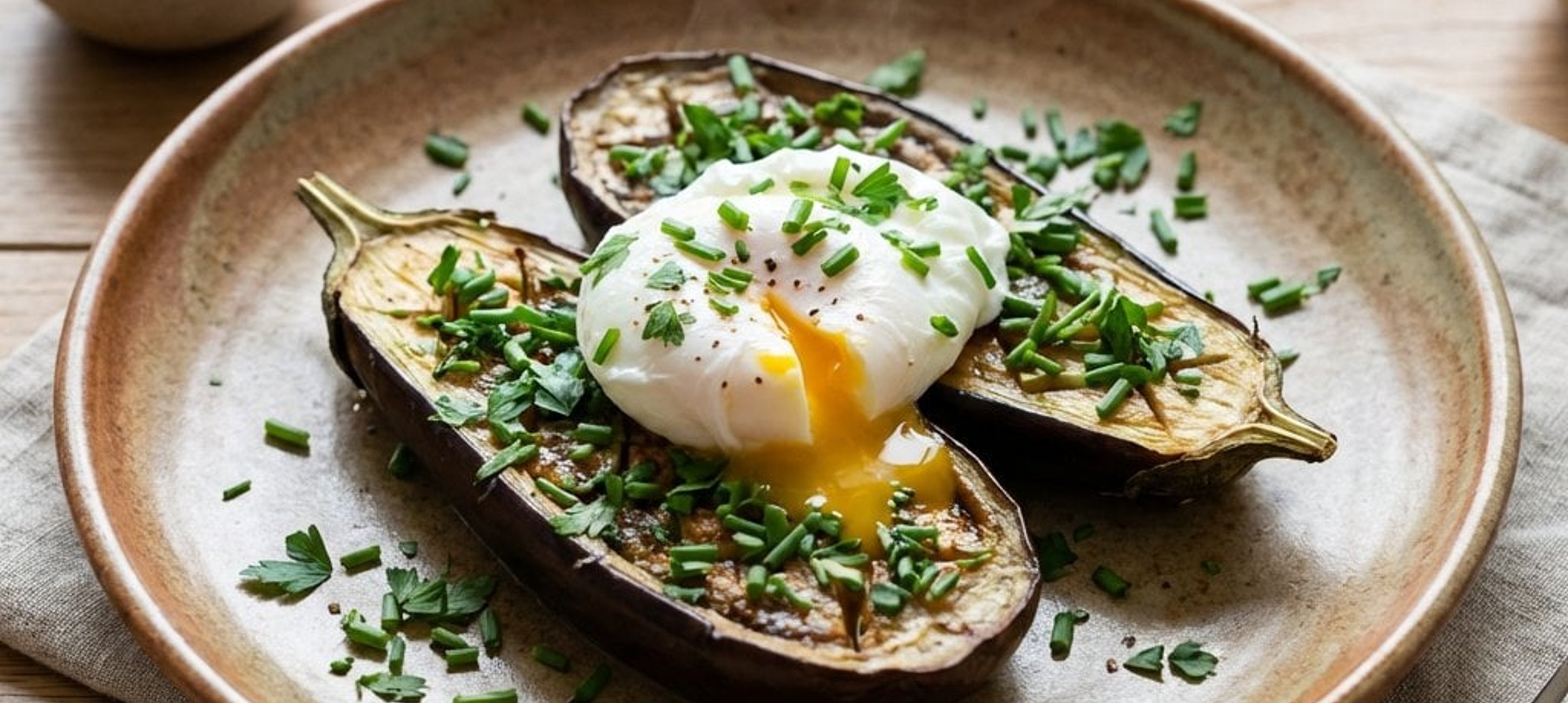 - 8Die Melanzani-Mischung auf Tellern anrichten, jeweils ein pochiertes Ei daraufsetzen, leicht salzen, pfeffern und mit frisch geschnittenem Schnittlauch bestreuen.