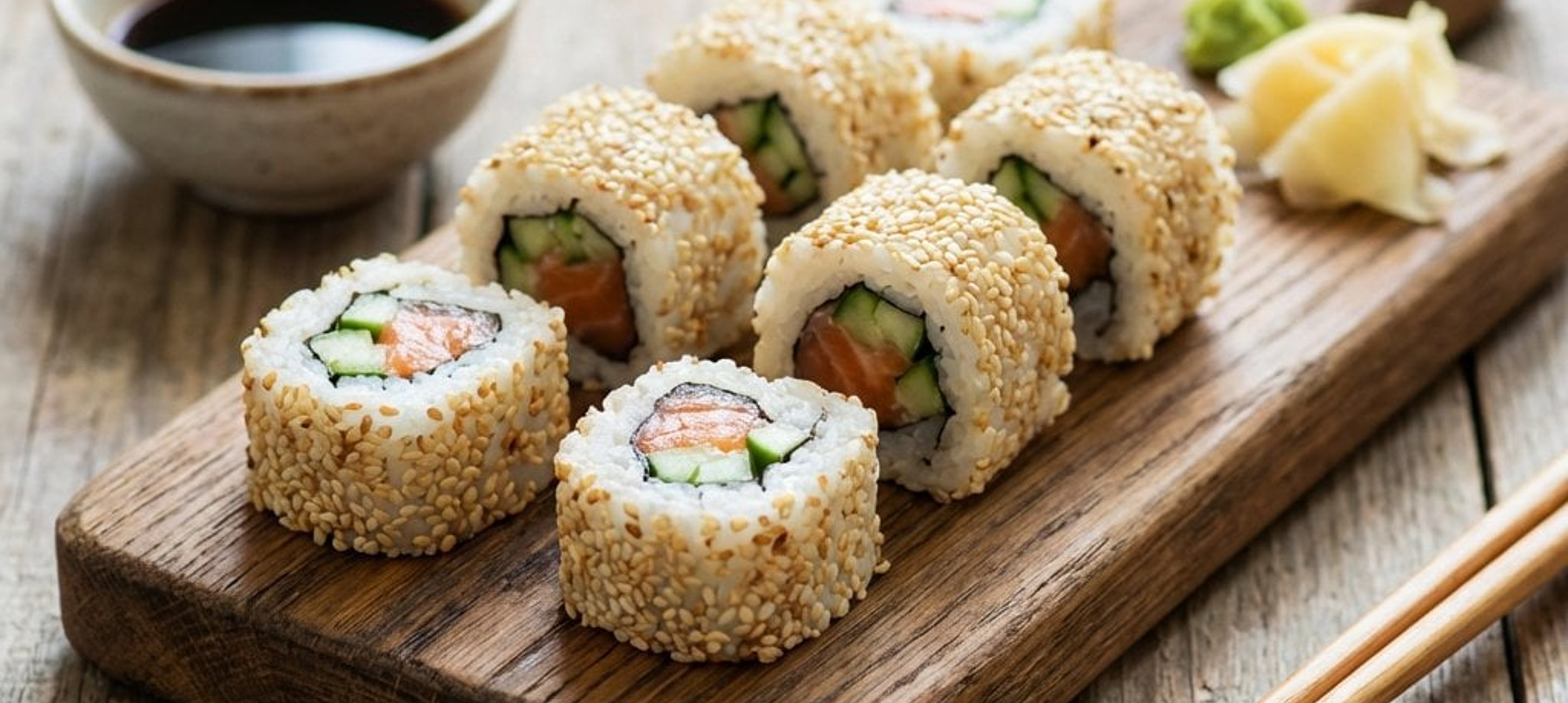 Wasabi und eingelegter Ingwer sind die klassischen Begleiter zu Sushi. Für das beste Ergebnis verwenden Sie ein sehr scharfes Messer, das Sie vor jedem Schnitt kurz in Wasser tauchen.