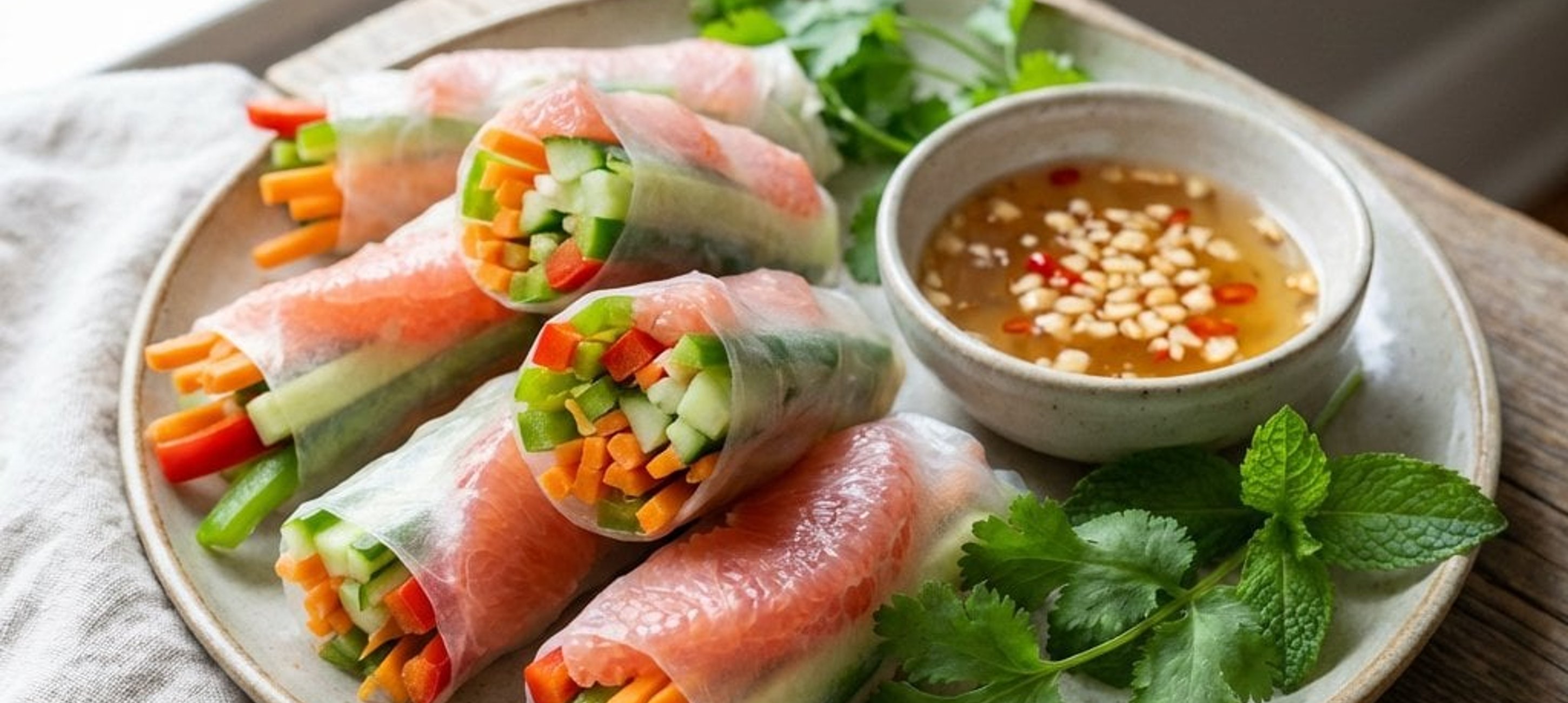 - 3Die Hände mit kaltem Wasser befeuchten. Das Reispapier zuerst von rechts and dann von links fest über die Füllung schlagen. Danach den unteren Rand über die Füllung klappen und die Rolle fest nach oben aufrollen. Die fertige Rolle auf eine Platte legen und den Vorgang mit den restlichen Zutaten wiederholen. Die Sommerrollen mit der gekühlten Dip-Sauce servieren.