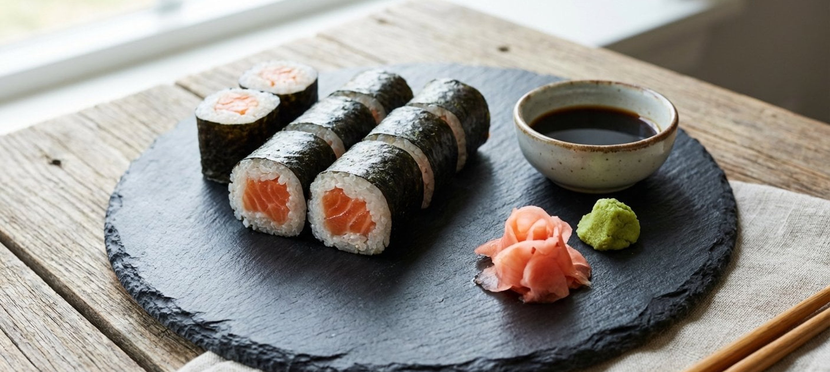 Verwenden Sie für Sushi immer ein sehr scharfes Messer und wischen Sie es zwischen den Schnitten mit einem feuchten Tuch ab – so erhalten Sie saubere Schnittkanten. Sushi-Ingwer neutralisiert den Geschmack zwischen den verschiedenen Bissen und fördert die Verdauung.