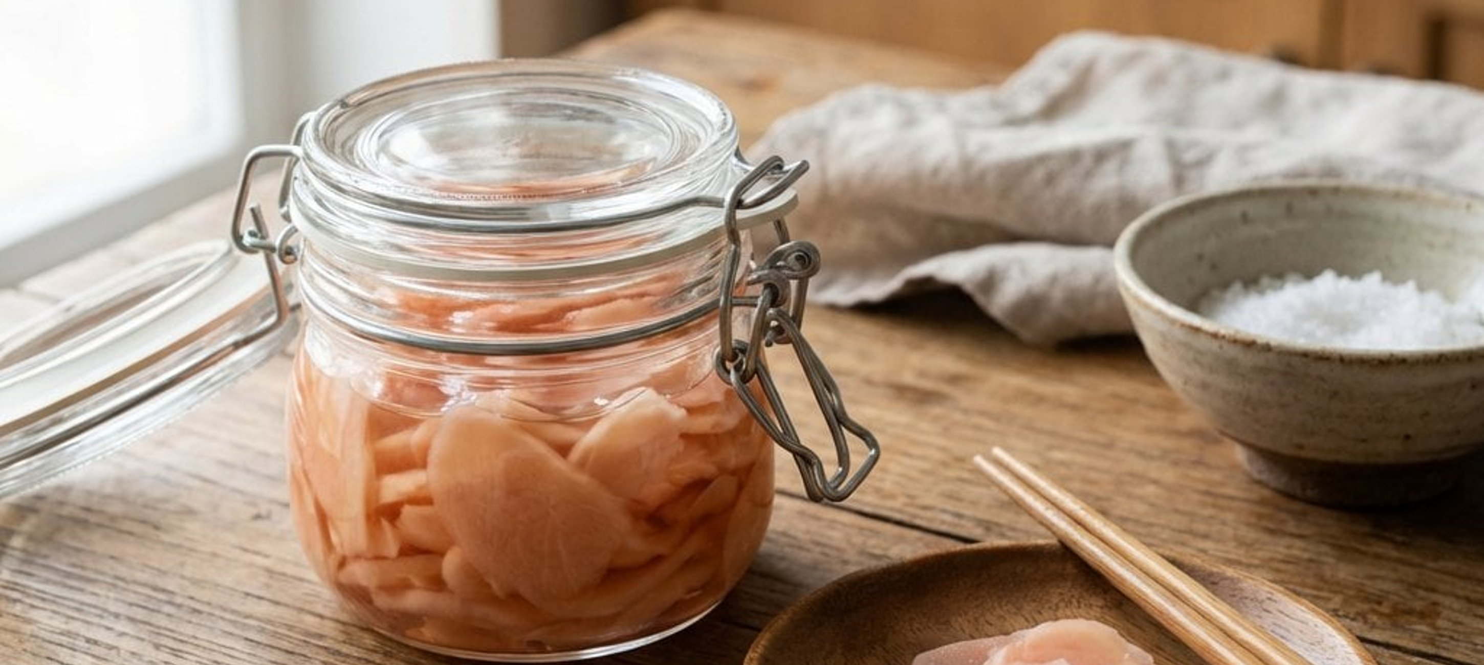 Ein kulinarischer Tipp: Wenn Sie den Ingwer besonders zart mögen, verwenden Sie ein japanisches Mandolinen-Messer für hauchdünne Scheiben. Der Ingwer schmeckt am besten, wenn er mindestens 24 Stunden im Kühlschrank ziehen konnte.