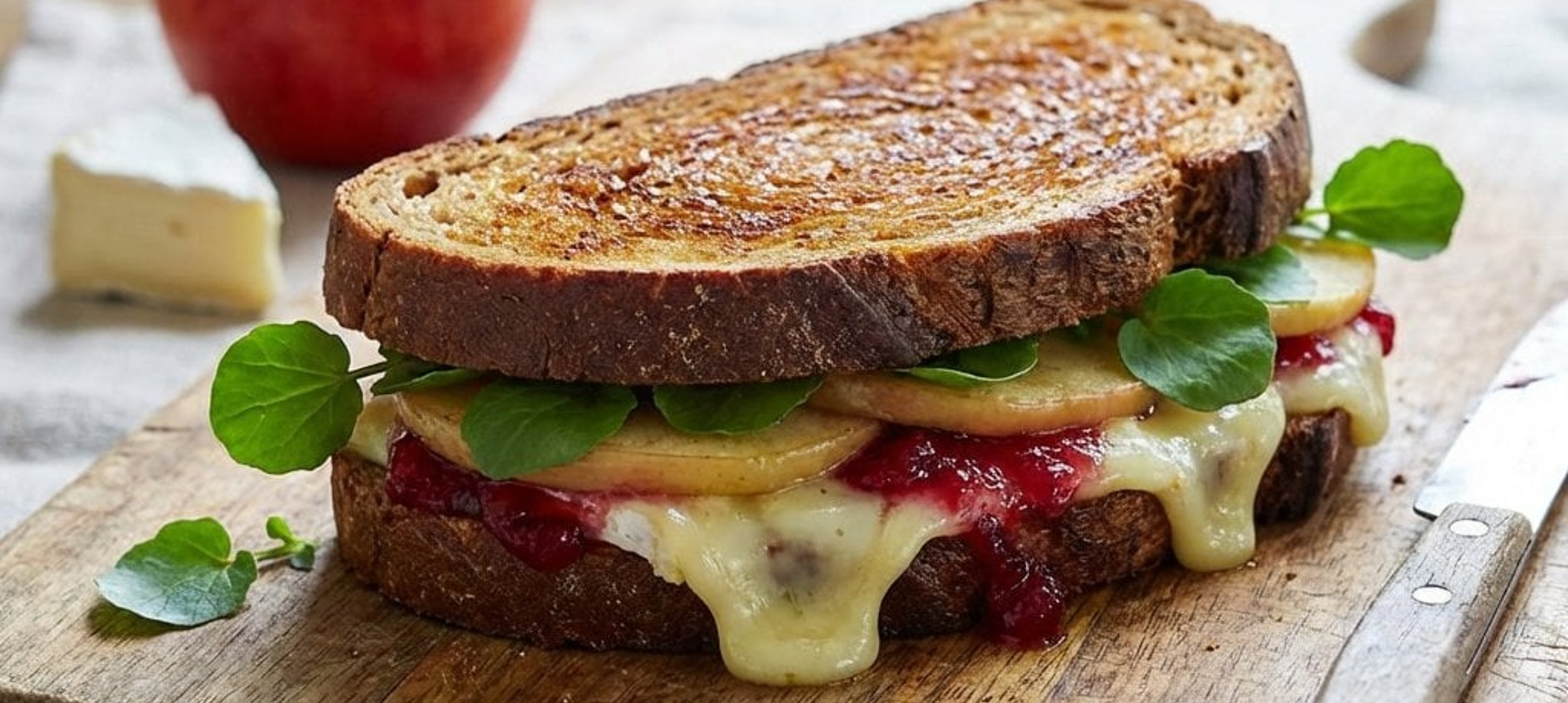 - 3Eine Pfanne bei mittlerer Hitze erwärmen. Eine Scheibe Toastbrot mit der Butterseite nach unten in die Pfanne legen. Darauf einen Teil der Käsescheiben, die marinierten Apfelspalten, etwas Kresse und einen Klecks Preiselbeermarmelade verteilen. Mit einer zweiten Toastscheibe abdecken (Butterseite nach oben).