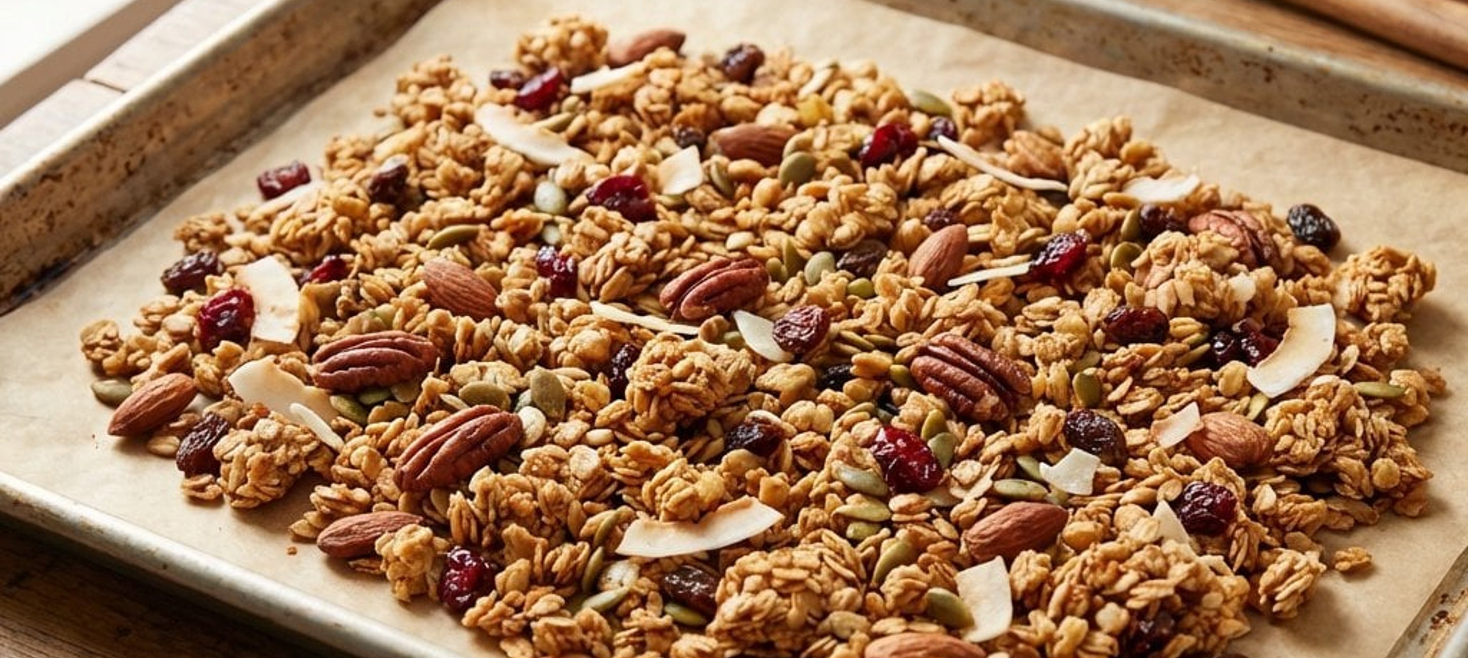 - 6Im vorgeheizten Ofen ca. 15 Minuten goldbraun backen. Nach dem Backen vollständig auskühlen lassen, damit das Müsli richtig knusprig wird, und anschließend in luftdichten Gläsern aufbewahren.
