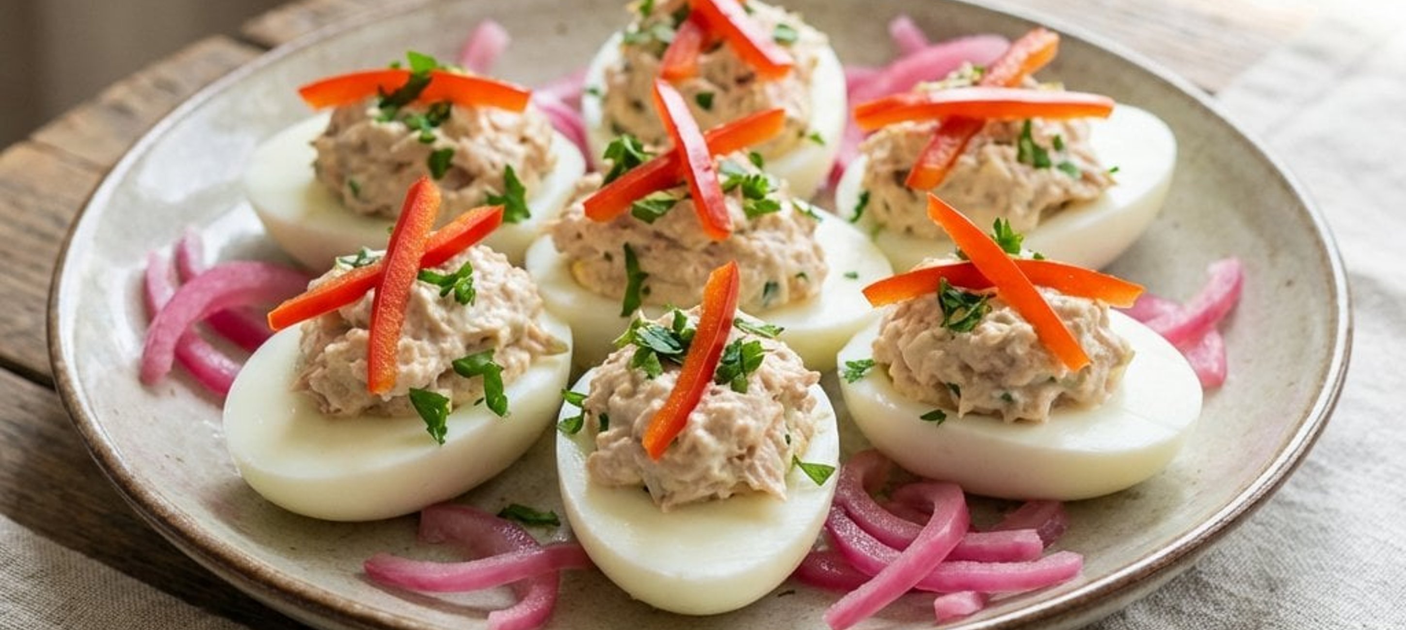 - 2Die Thunfischmischung mit einem Teelöffel in die Vertiefungen der Eiweiße füllen. Jeweils einen Dotter darauf setzen. Die marinierten Zwiebeln auf Tellern verteilen, die gefüllten Eier darauf anrichten und mit den Paprikastreifen sowie der Petersilie garnieren.