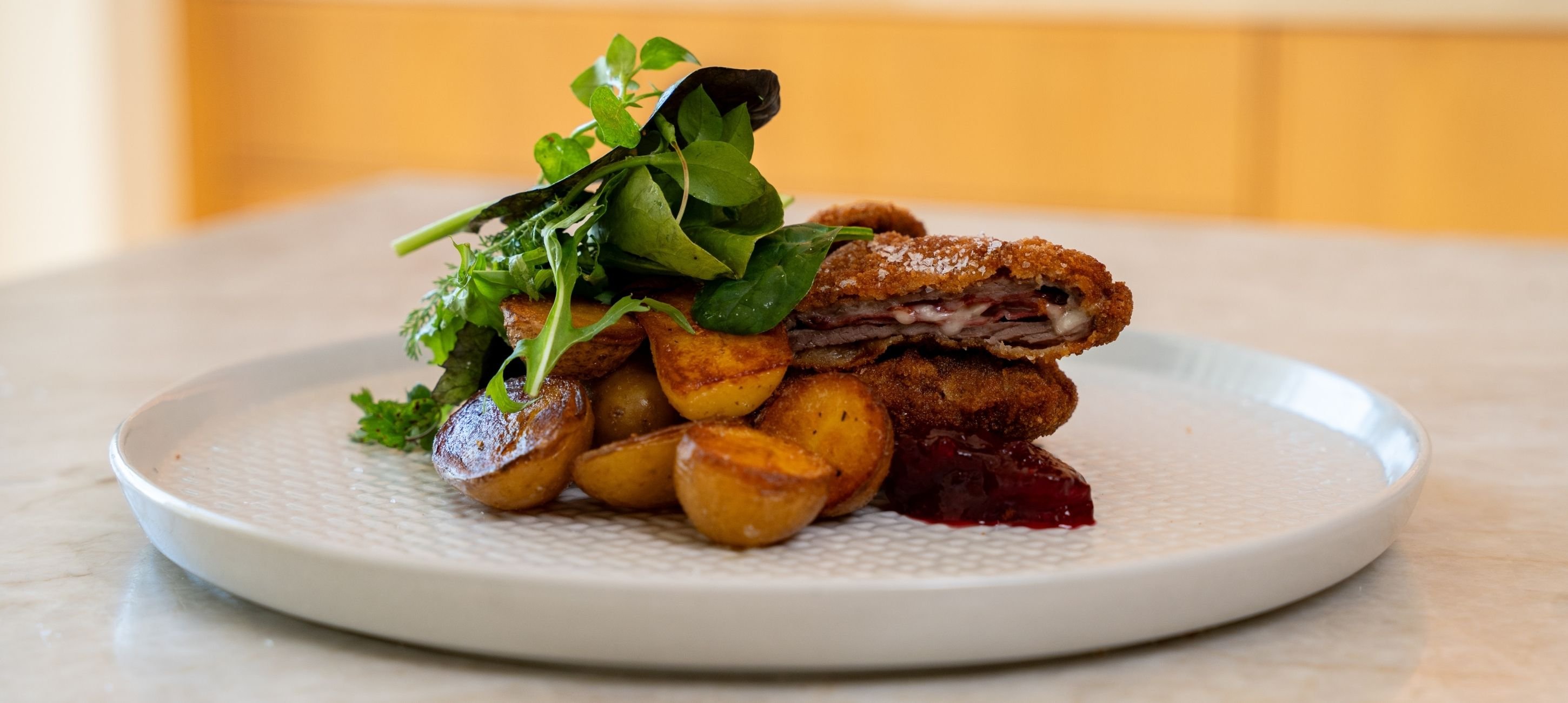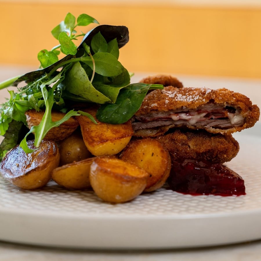 - 7Den Kräutersalat mit etwas Salz, Zitrone & Olivenöl marinieren und mit den Bratkartoffeln und Preiselbeeren zum Cordon-Bleu servieren.