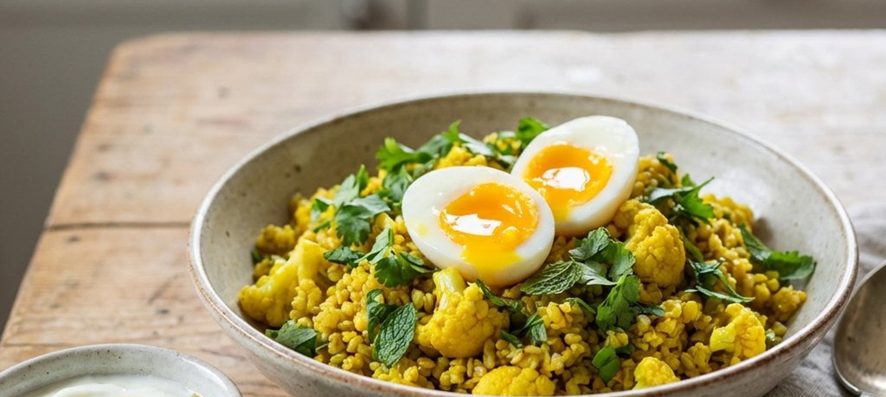 - 5Den fertigen Bulgur mit einer Gabel auflockern, auf Tellern anrichten und mit dem kühlen Joghurt sowie den halbierten Eiern servieren. Mit frischen Kräutern bestreuen. Guten Appetit!