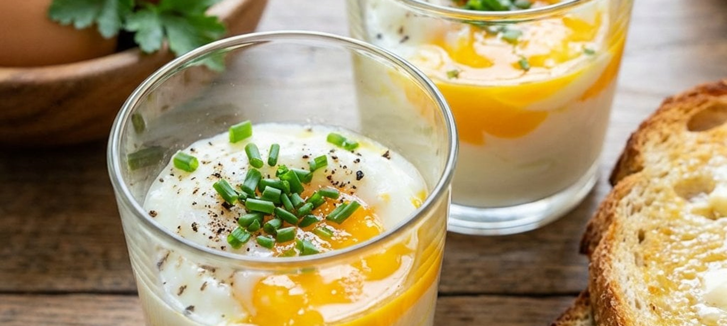 - 3Brechen Sie die Eier im Glas mit dem Löffel leicht auf, damit das Eigelb auslaufen kann. Mit Meersalz und frisch gemahlenem Pfeffer würzen, mit reichlich Schnittlauch bestreuen und sofort mit dem warmen Buttertoast servieren.