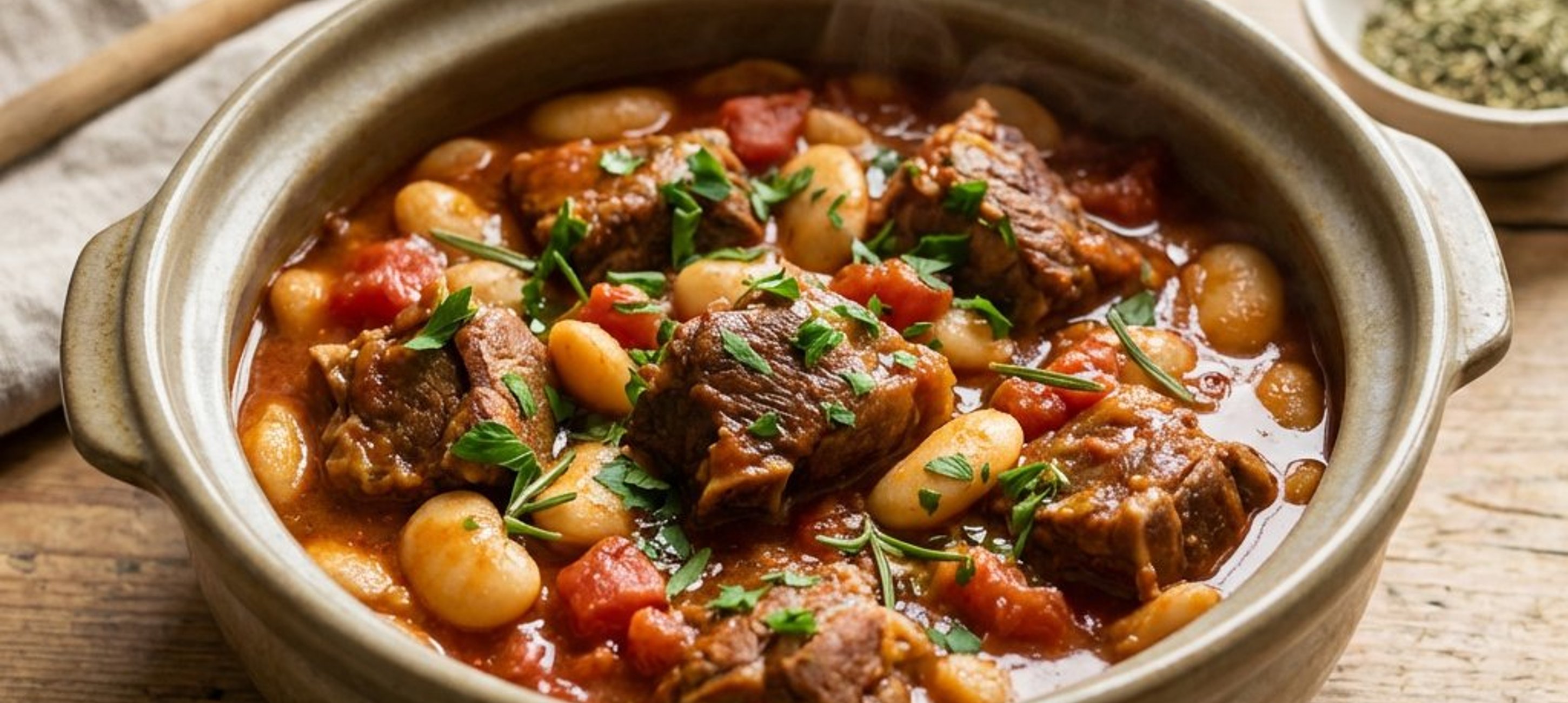 - 1Mit den restlichen 600 ml Rinderfond aufgießen, zum Kochen bringen und die Hitze reduzieren. Zugedeckt bei geringer Hitze ca. 50 Minuten schmoren lassen. Sobald das Fleisch zart ist, die gekochten Bohnen zusammen mit der Hälfte des aufgefangenen Kochsuds hinzufügen. Knoblauch einrühren.
