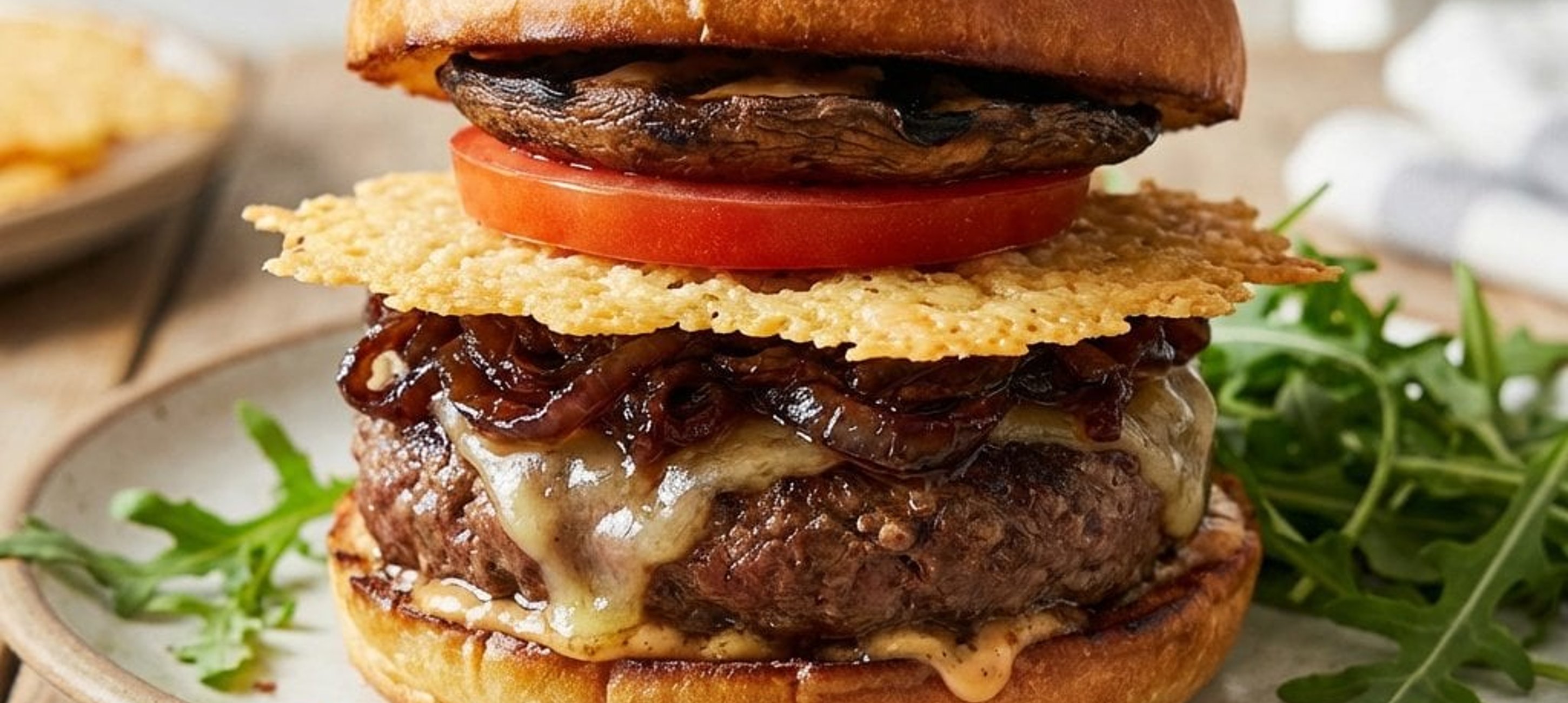 - 5Anrichten: Beide Seiten des Buns mit Ketchup bestreichen. Auf die Unterseite das Fleisch legen, darauf die karamellisierten Zwiebeln, den Parmesan-Chip, den Paradeiser und den Portobello-Pilz. Mit der oberen Bun-Hälfte abschließen und sofort servieren.