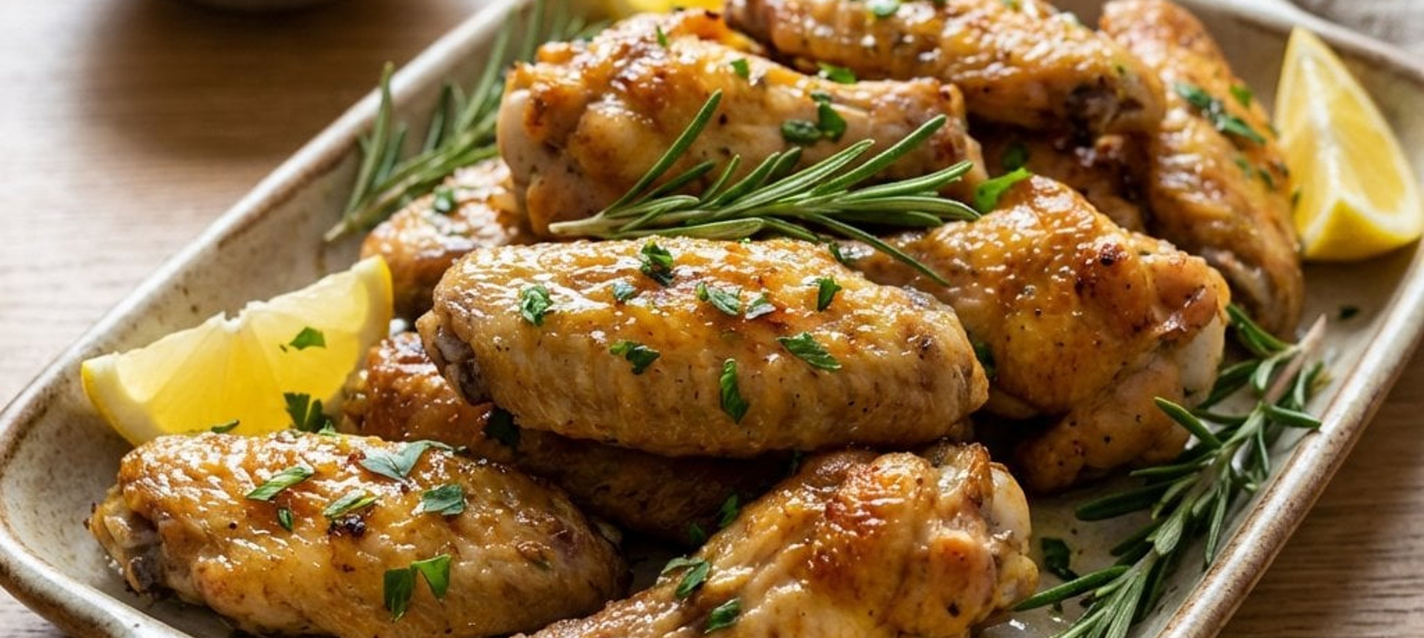 Servieren Sie die Flügel mit einem frischen Dip aus Sauerrahm und Kräutern oder klassischen Braterdäpfeln.