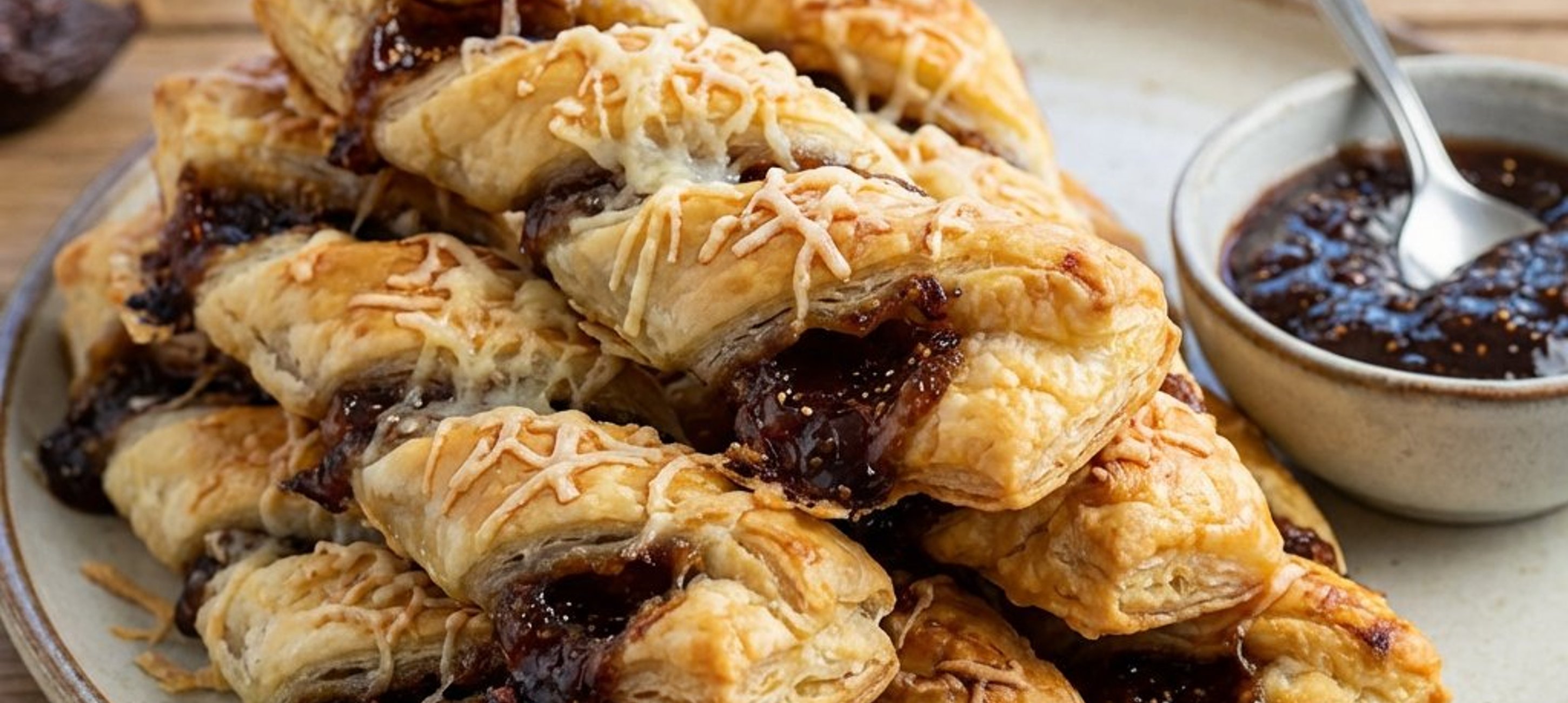 - 4Eine Teighälfte gleichmäßig mit der Feigenmarmelade bestreichen und mit geriebenem Pecorino bestreuen. Die zweite Teighälfte mit der bestrichenen Seite nach unten darauflegen und leicht andrücken. Den Teig in ca. 1 cm breite Streifen schneiden, diese spiralförmig eindrehen und auf ein mit Backpapier belegtes Blech legen. Im vorgeheizten Ofen 15–20 Minuten goldbraun backen.