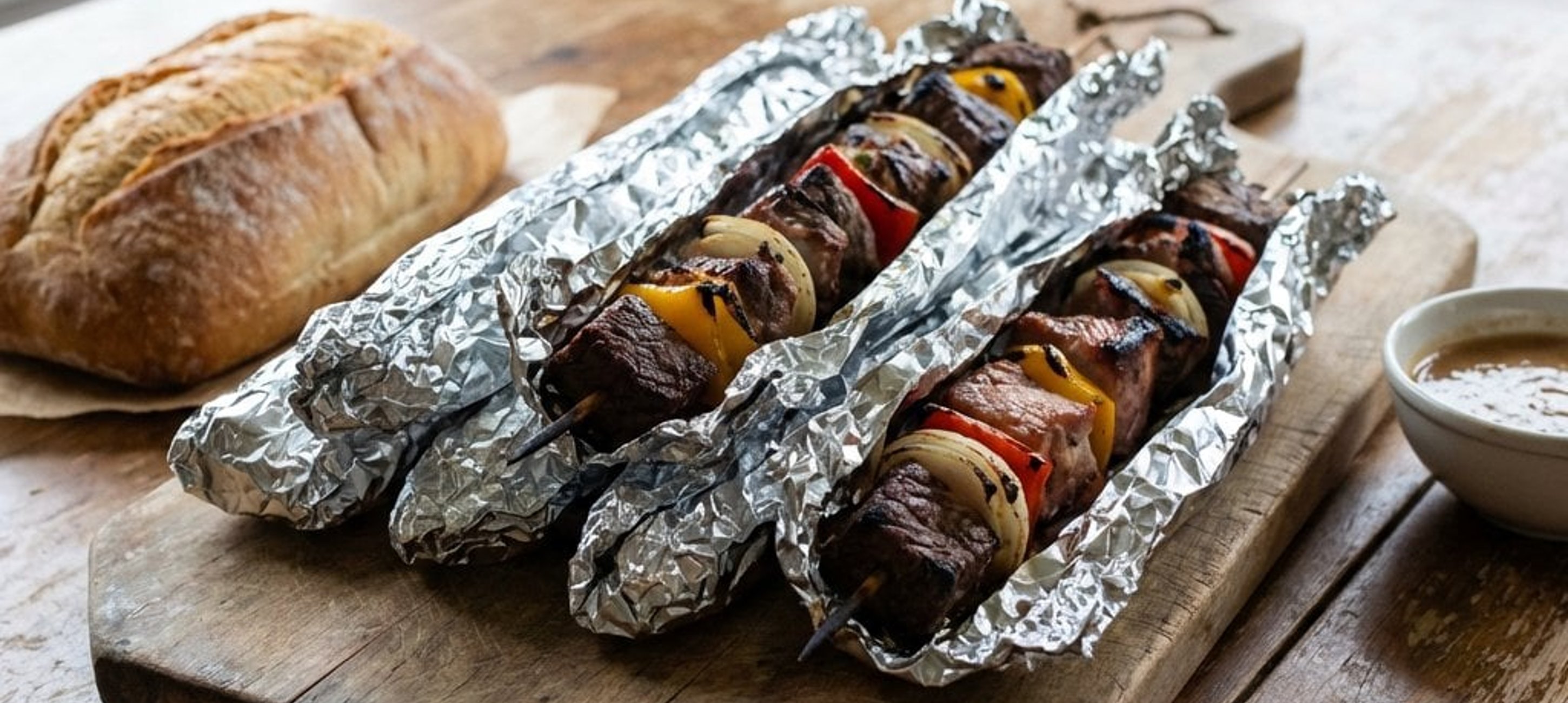 - 3Die Spieße im vorgeheizten Ofen ca. 30 Minuten garen. Danach aus dem Ofen nehmen und noch 10 Minuten in der Folie ruhen lassen. Mit frischem Hausbrot servieren.