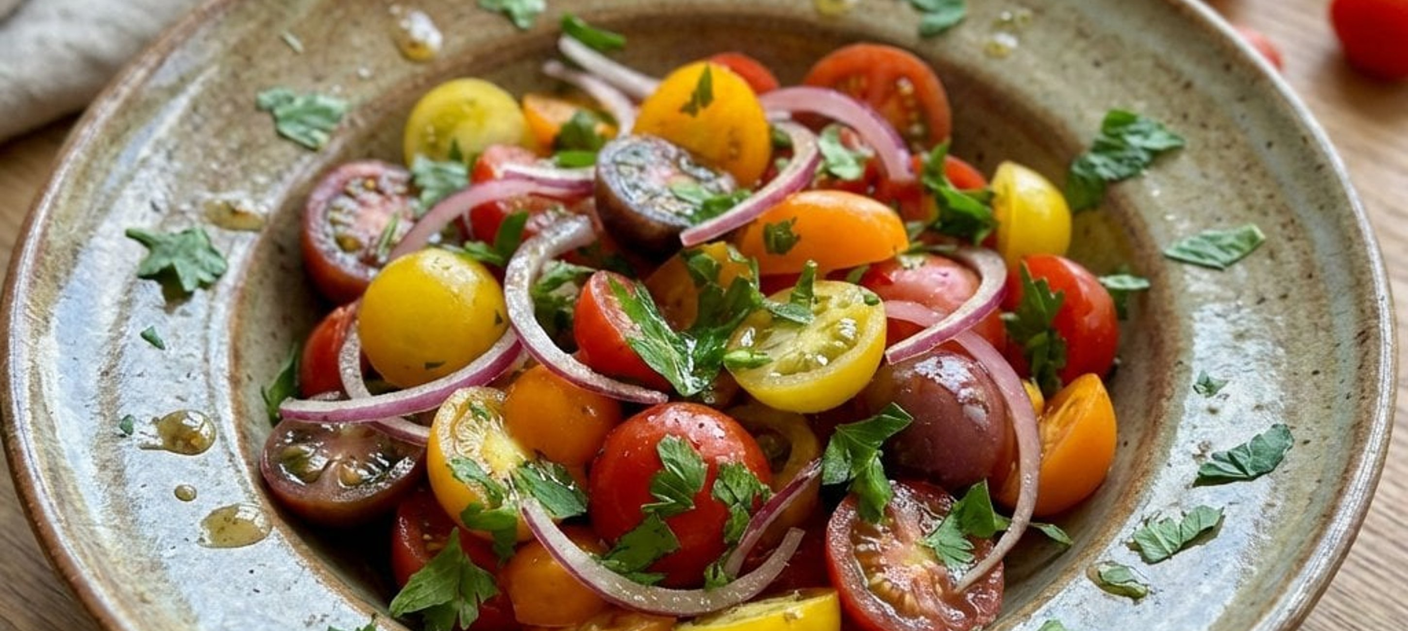 Der Salat schmeckt am besten, wenn er 10-15 Minuten im Kühlschrank durchziehen kann. So verbinden sich die Aromen der Marinade perfekt mit den Paradeisern.