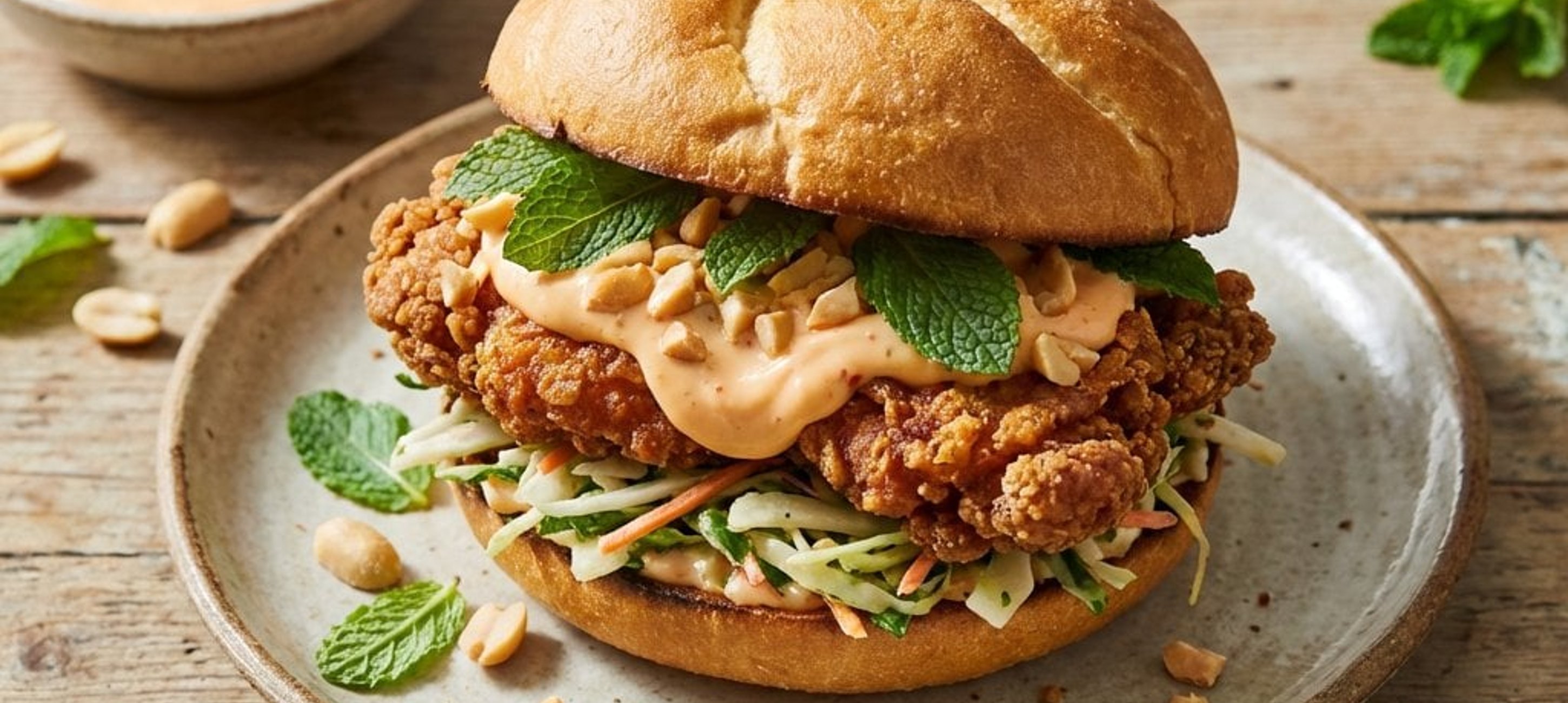- 4Die Kaisersemmeln waagrecht aufschneiden, die Schnittflächen mit Butter bestreichen und in einer Pfanne goldbraun anrösten. Die gerösteten Semmelhälften großzügig mit der Sriracha-Mayonnaise bestreichen. Auf die Unterseite jeweils ein Stück Hendl und eine Portion Salat geben, dann die obere Semmelhälfte daraufsetzen. Sofort servieren.