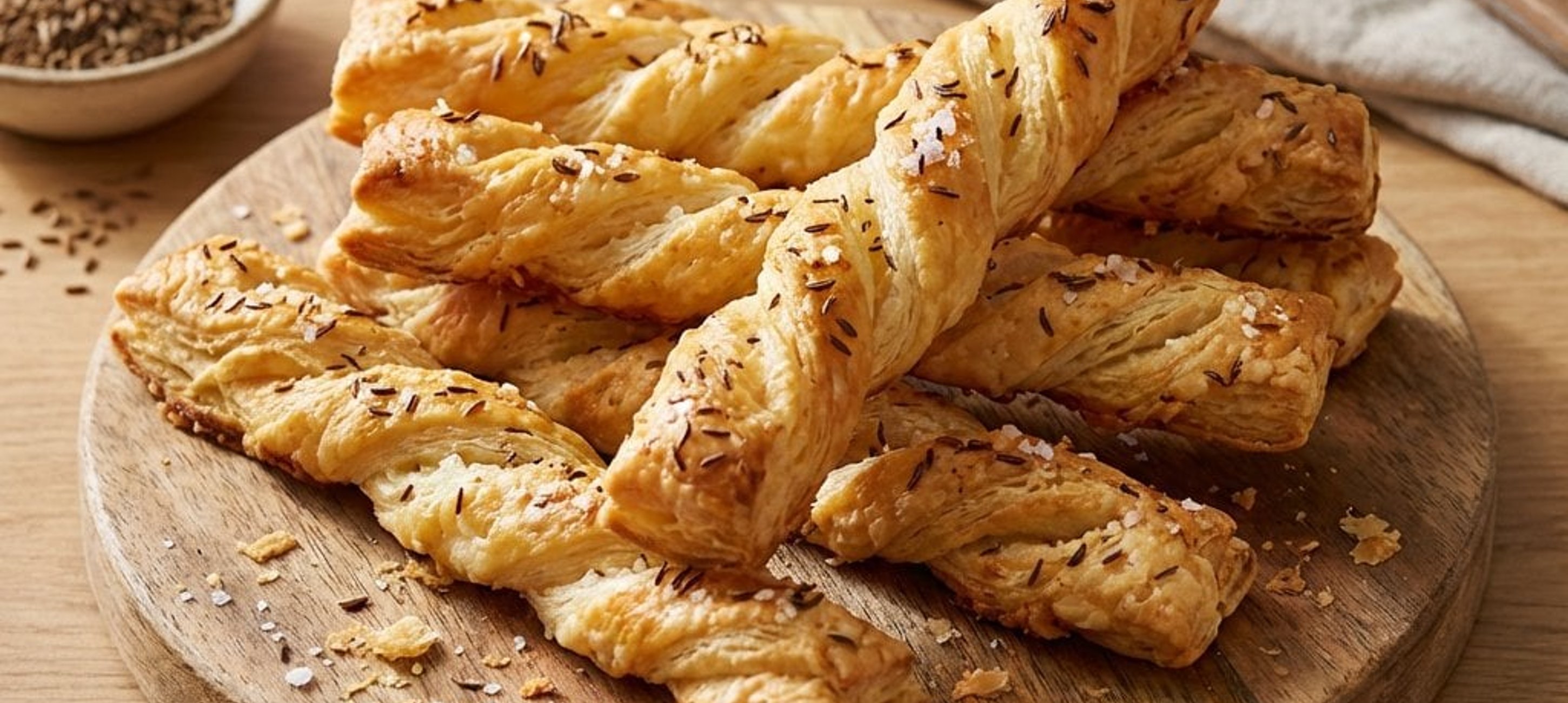 - 4Die doppelte Teigplatte in ca. 1 cm breite Streifen schneiden. Die Streifen spiralförmig zu Stangerl drehen und auf das vorbereitete Backblech legen.
