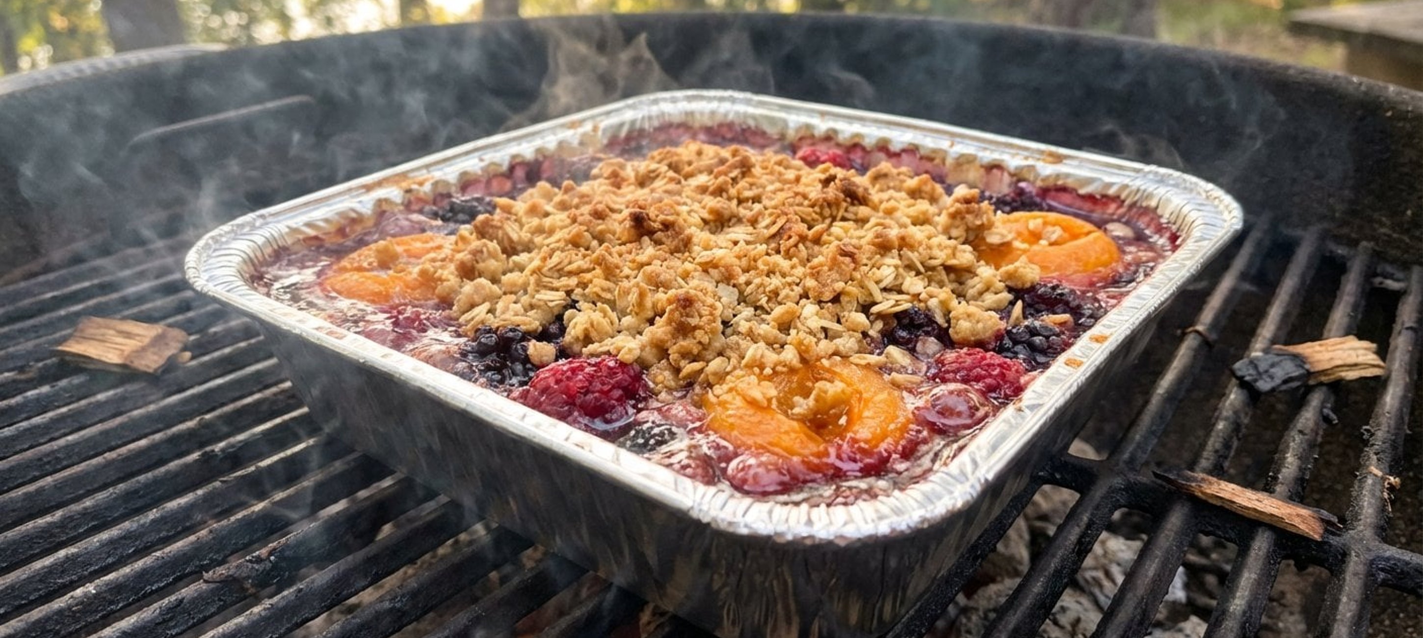 Servieren Sie das Crumble am besten direkt aus der Grillschale, solange es noch dampft. Eine Kugel Vanilleeis sorgt für den perfekten Temperaturkontrast!