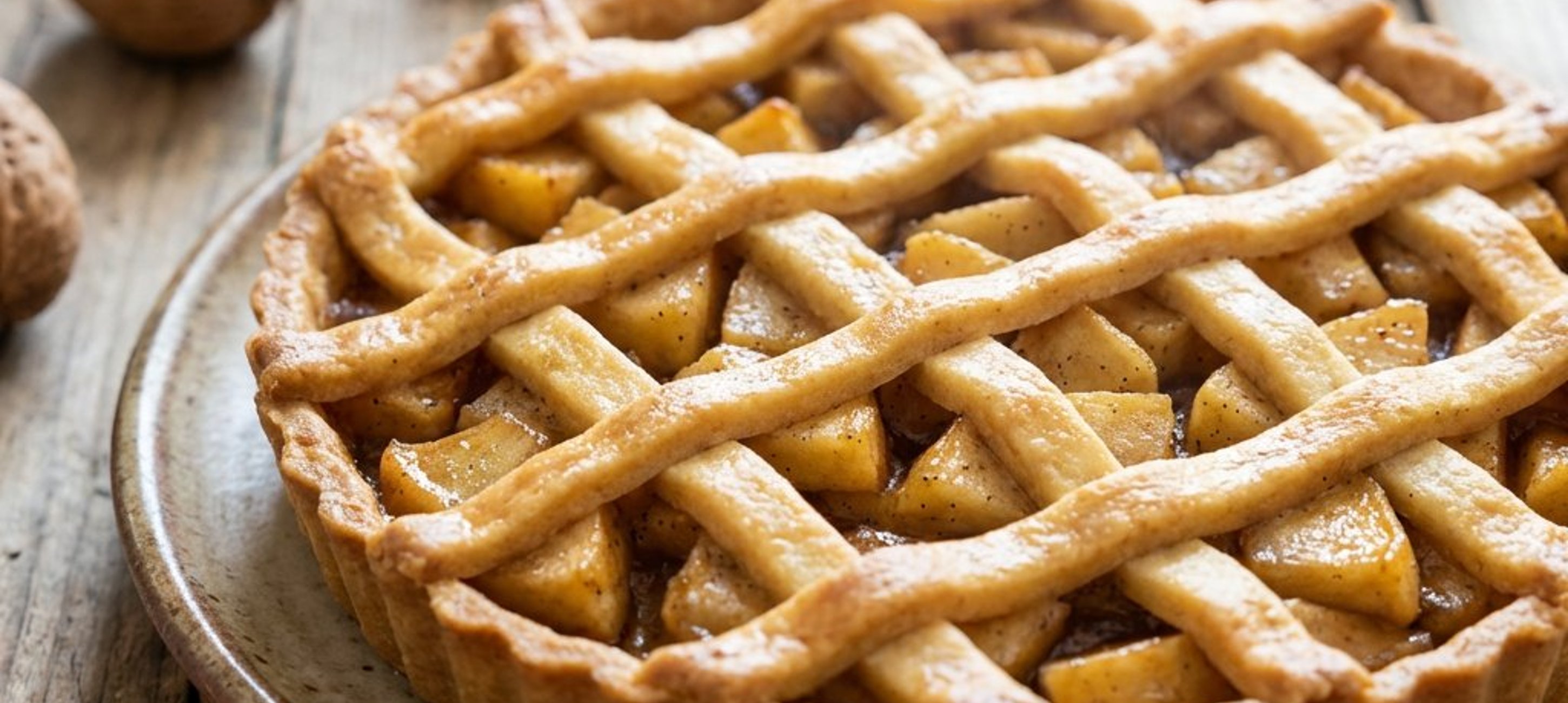 - 3Die zweite Teighälfte auf einer bemehlten Arbeitsfläche ca. 4 mm dick ausrollen. In ca. 1,5 cm breite Streifen schneiden und diese gitterförmig auf die Apfelfüllung legen.