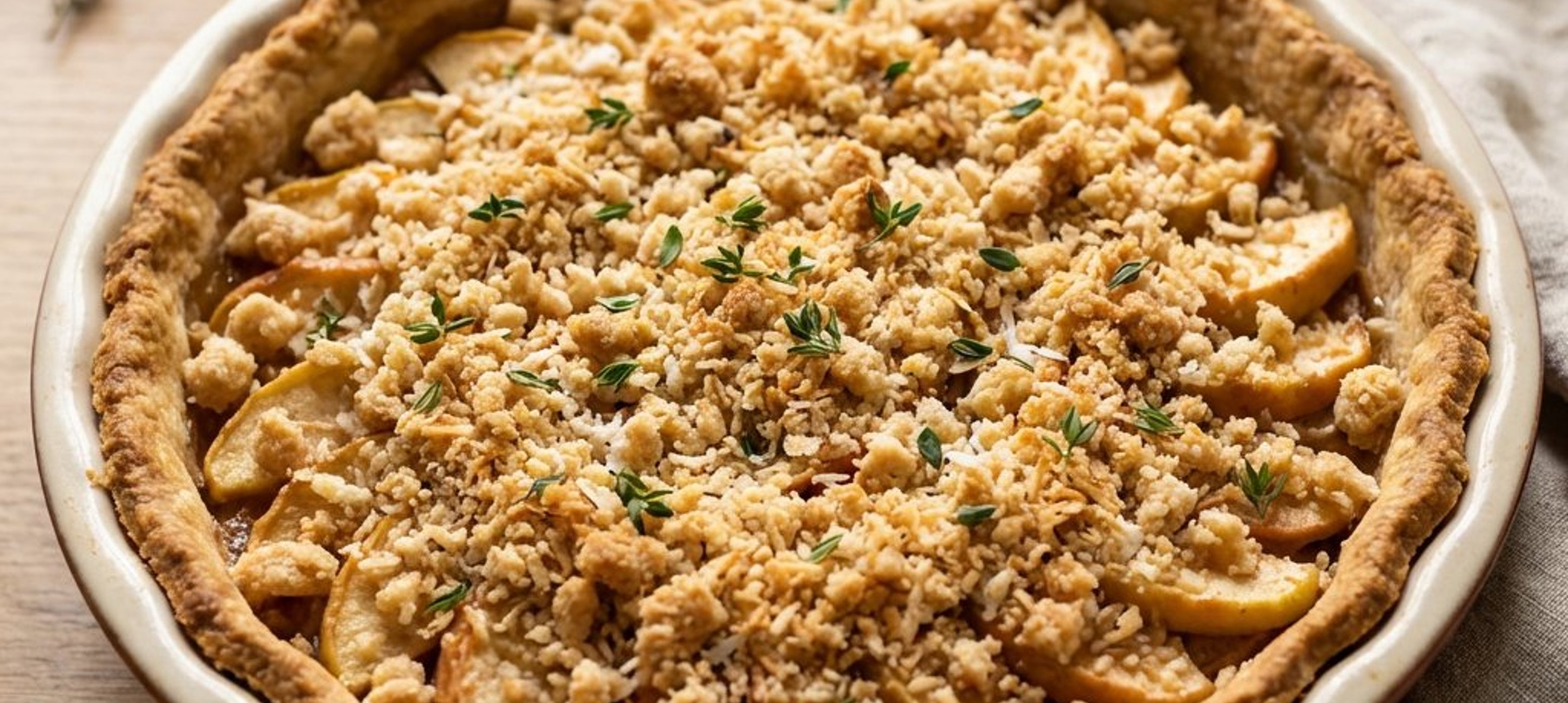 - 1Während der Teig kühlt, die Äpfel schälen, vierteln und das Kerngehäuse entfernen. Die Äpfel in feine Spalten schneiden und mit dem Rohrzucker und den Thymianblättchen vermengen.