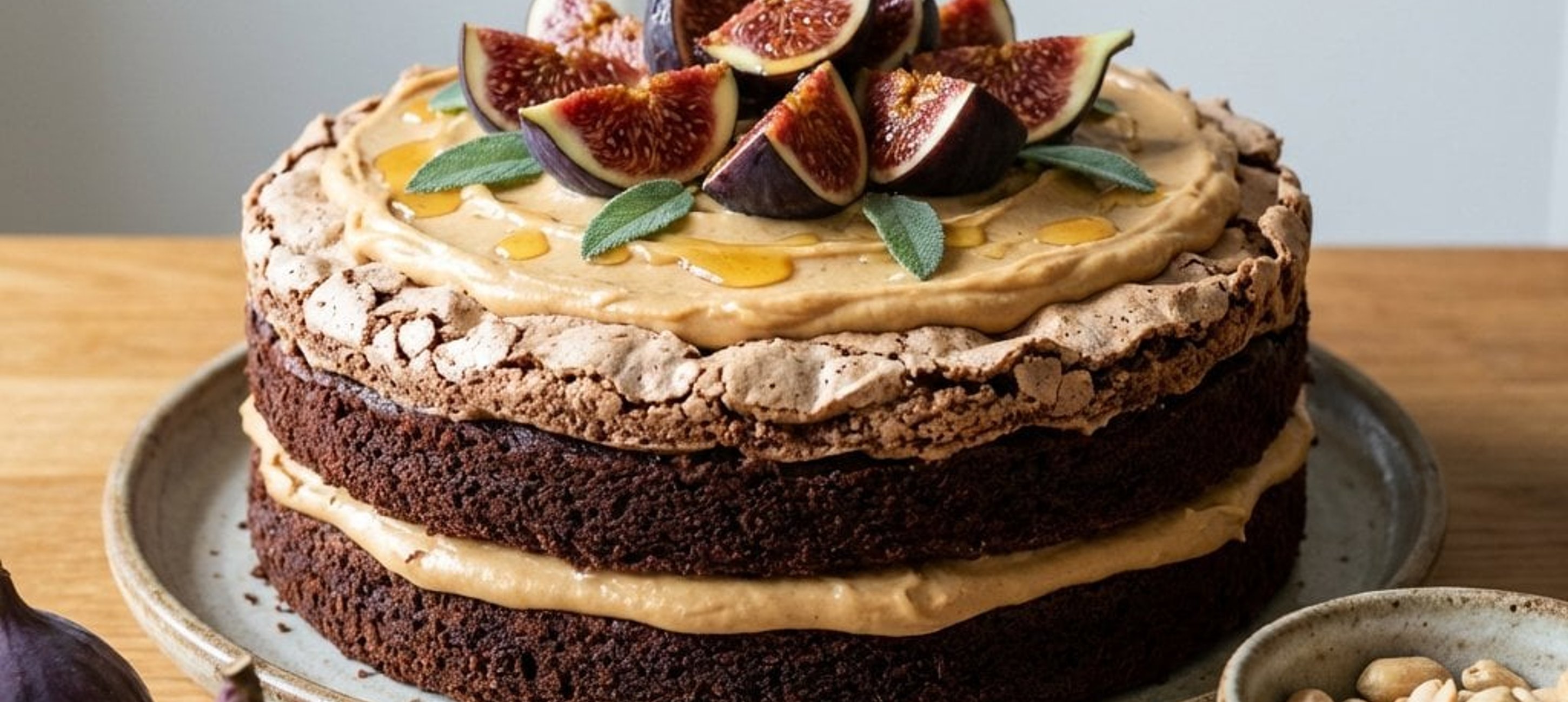 - 3Zusammenbau: Den Schokoboden waagerecht halbieren. Die untere Hälfte mit Feigenmarmelade und der Schokocreme bestreichen. Die zweite Bodenhälfte daraufsetzen. Die Erdnusscreme darauf verteilen und mit der Baiserschicht abschließen. Die Torte mindestens 2 Stunden kühlen. Vor dem Servieren mit frischen Feigenspalten, Salbeiblättern und etwas Honig garnieren.