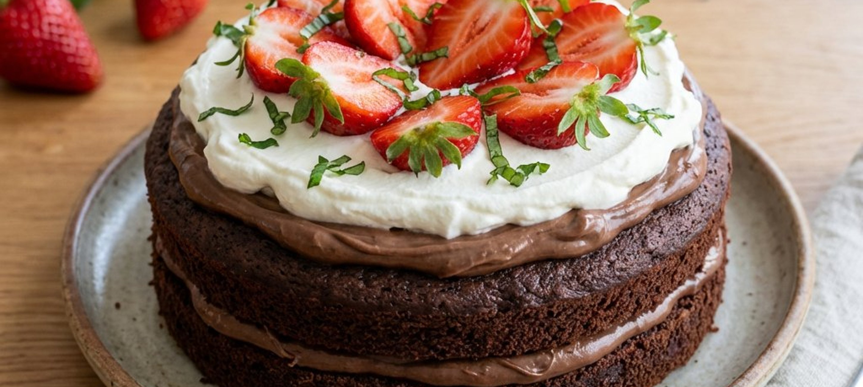 - 3Den zweiten Boden auflegen und den Vorgang wiederholen. Die Torte oben mit den restlichen Erdbeeren (mit Stiel) und ganzen Basilikumblättern dekorieren.