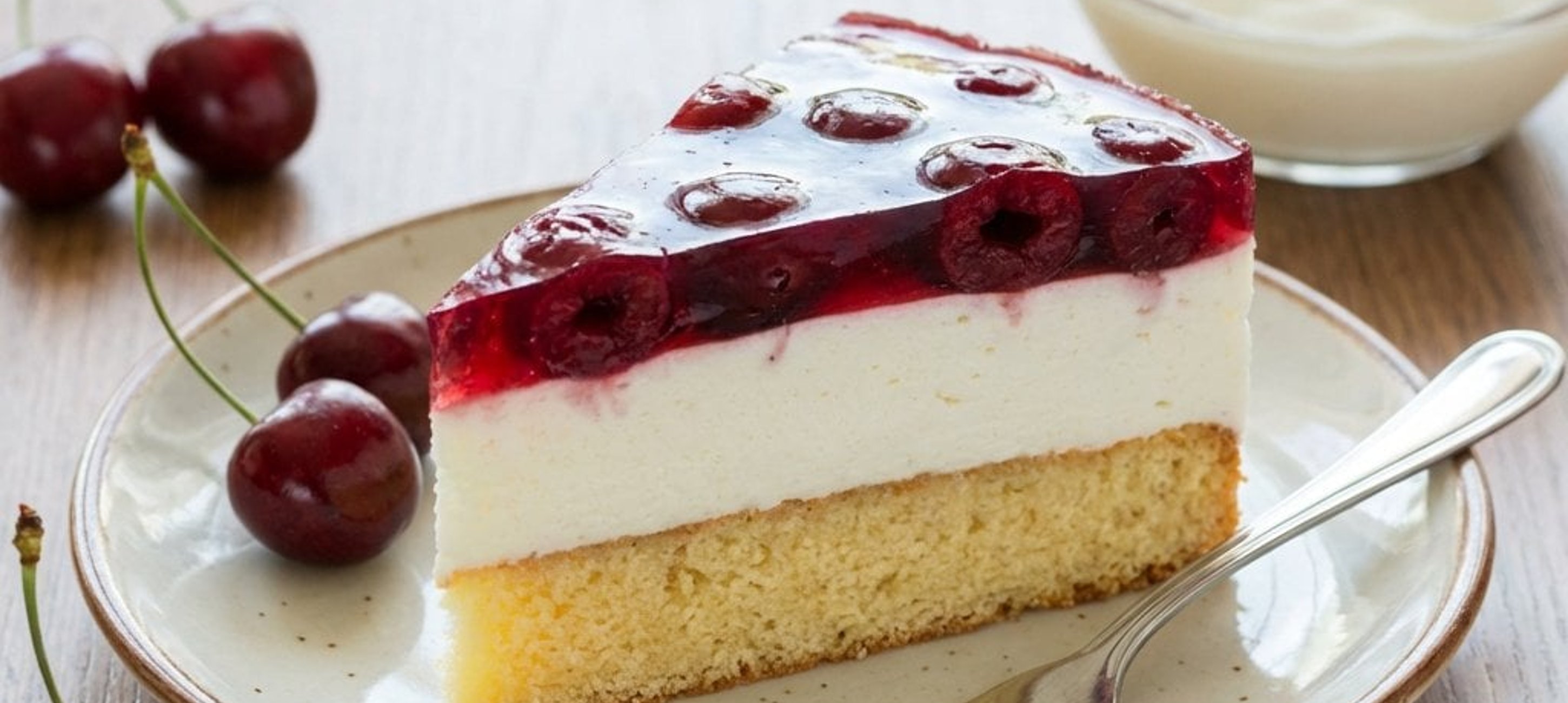 - 3Das Weichselgelee vorsichtig auf die fest gewordene Sauerrahmcreme gießen. Die Torte für mindestens 2 Stunden (am besten über Nacht) im Kühlschrank fest werden lassen. Vor dem Servieren vorsichtig aus der Form lösen.