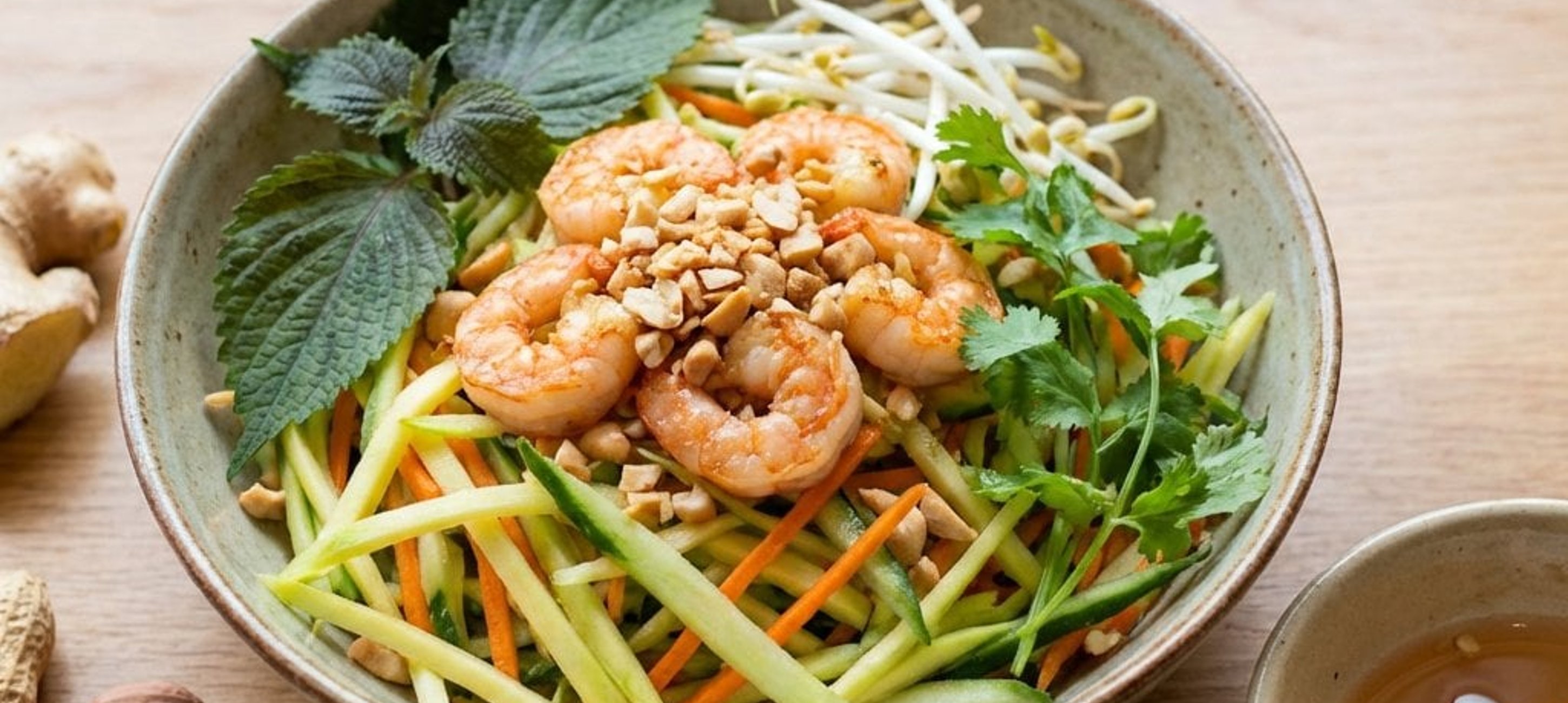 - 1Die Mango, die Karotte und die Salatgurke in feine Streifen (Julienne) schneiden. Die Mungobohnensprossen sowie die gehackte Perilla, die vietnamesische Melisse und den Koriander in eine große Schüssel geben.