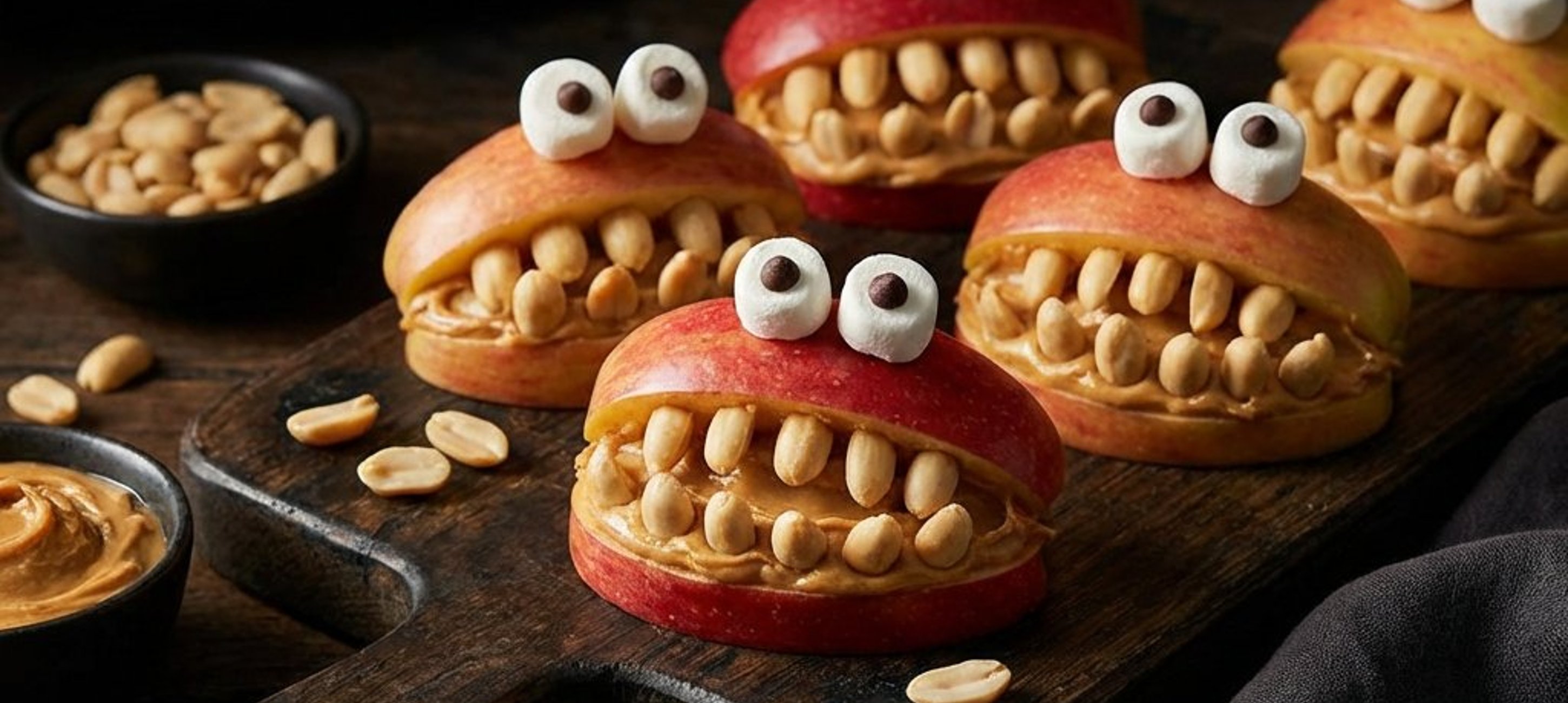 - 3In die mit Erdnussbutter gefüllten Münder nun die ungesalzenen Erdnüsse als Zähne einsetzen. Lassen Sie die Kinder beim Suchen der passenden "Zahngrößen" helfen – das macht besonders viel Spaß!
