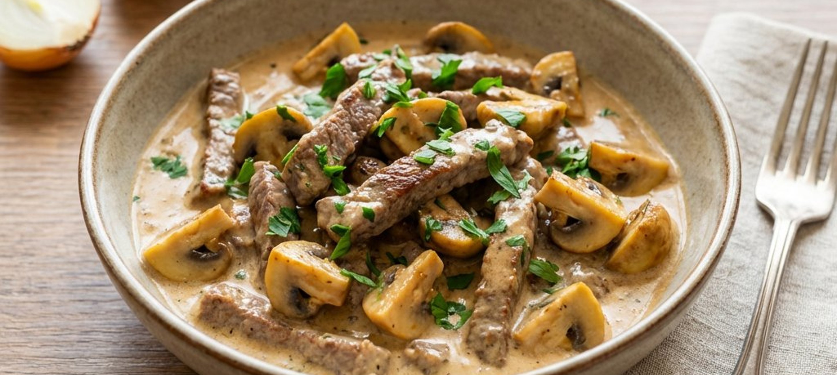 Servieren Sie das Boeuf Stroganoff klassisch mit Reis oder breiten Bandnudeln. Ein Klecks extra Sauerrahm und frische Petersilie runden das Gericht optisch und geschmacklich ab.