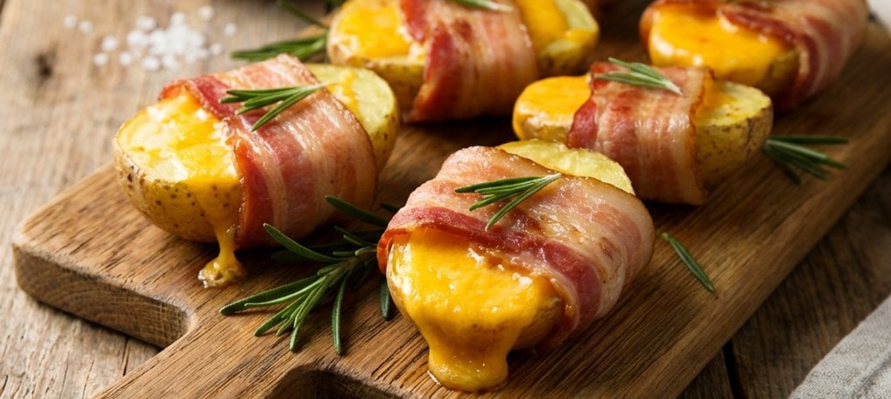 - 3Den Backofen auf 180 °C vorheizen. Den Cheddar in dünne Scheiben schneiden. Jede Kartoffel längs zu etwa zwei Dritteln einschneiden, eine Scheibe Käse hineinschieben, mit einer Scheibe Speck umwickeln und mit einem kleinen Rosmarinzweig fixieren.