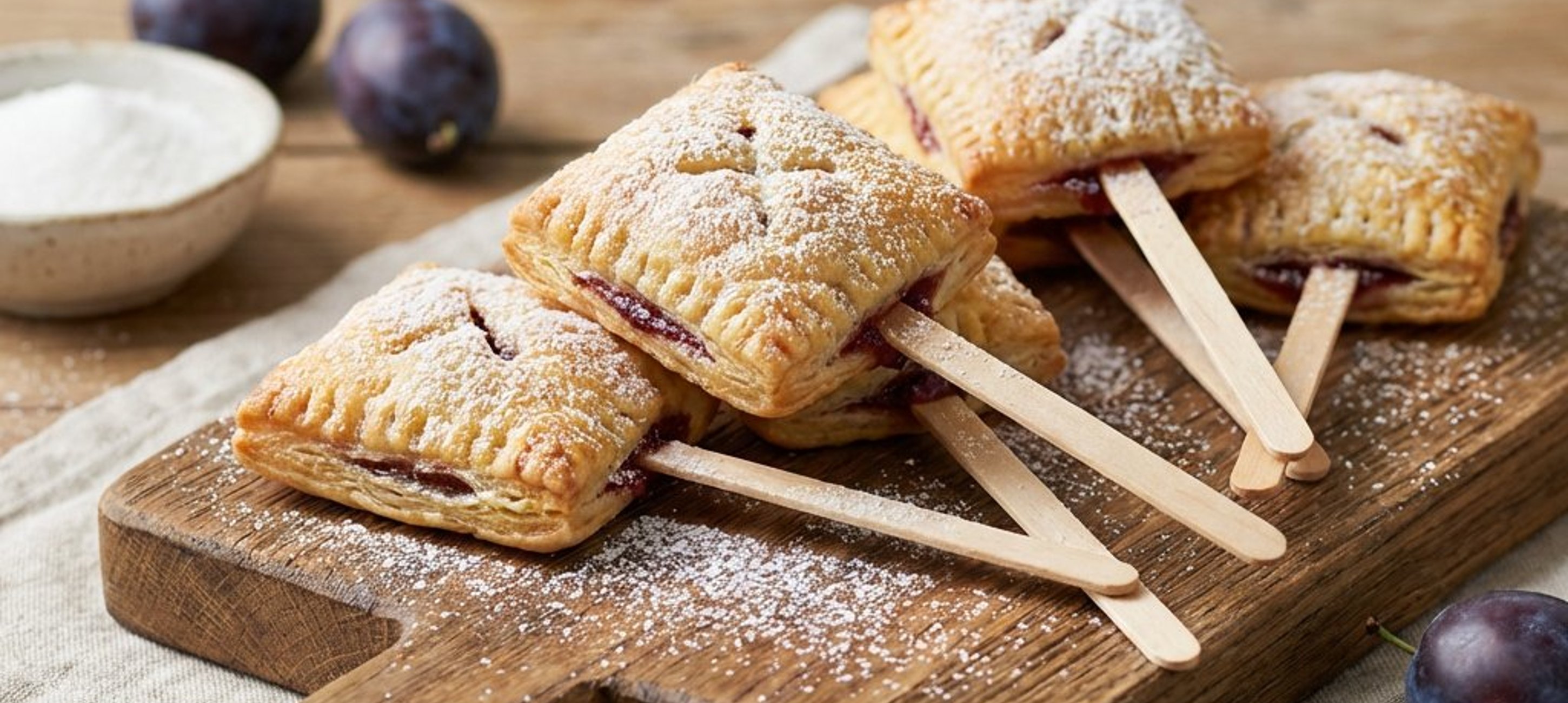 Verwenden Sie für die Pie Pops klassische Holzspieße, die Sie bei Bedarf halbieren können. Achten Sie darauf, dass die Stäbchen backfest sind.