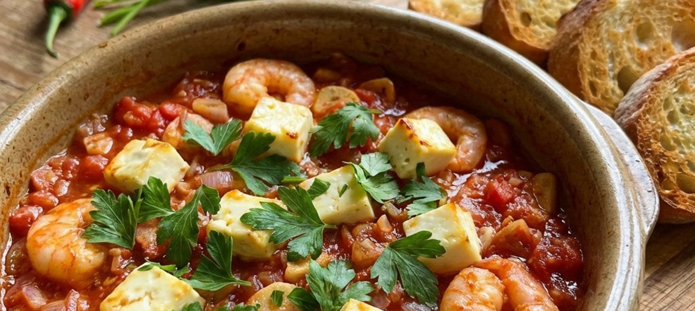 - 1In der Zwischenzeit den Feta in kleine Würfel schneiden und die Petersilie hacken. Die Garnelen mit Salz und Pfeffer würzen. Garnelen, Petersilie und vorsichtig den Feta unter die Paradeisersauce mischen. Die Mischung in eine Auflaufform (oder Portionsförmchen) füllen und im Ofen ca. 20 Minuten backen. In den letzten Minuten das Baguette mit in den Ofen geben, bis es knusprig und warm ist. Heiß servieren.