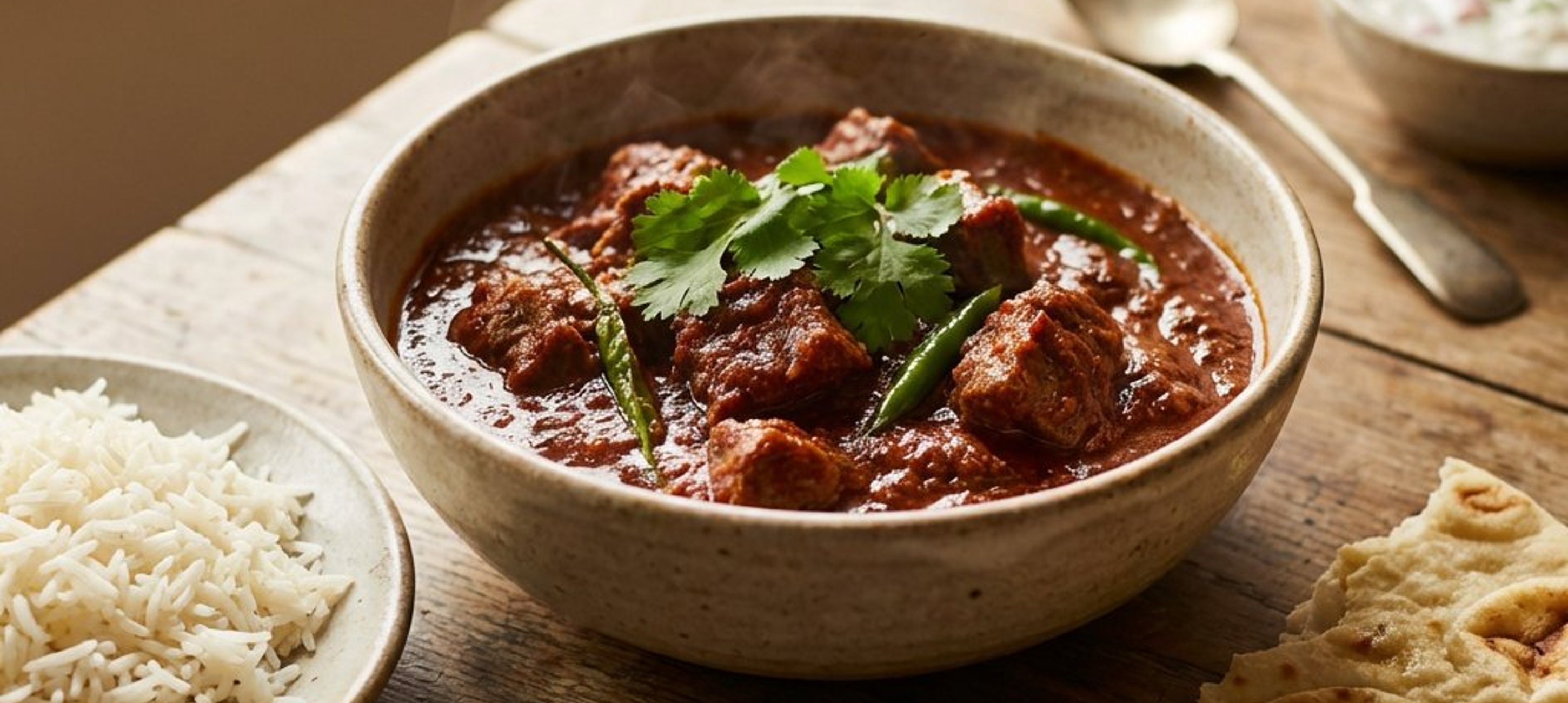 - 3Das fertige Curry mit frischem Koriander garnieren und zusammen mit dem Reis und dem Naan-Brot servieren.