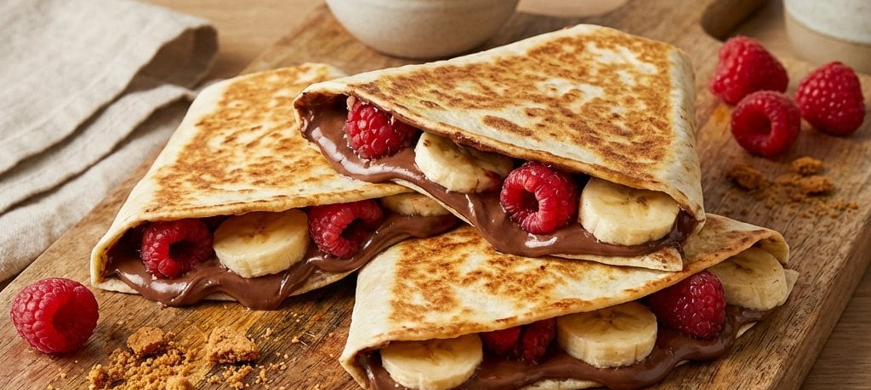 - 5Nun den Wrap falten: Zuerst das Viertel mit dem Schokoaufstrich über die Bananen klappen, dann diese beiden Teile über die Kekse falten und zum Schluss über die Himbeeren klappen, sodass ein kompaktes Dreieck entsteht.
