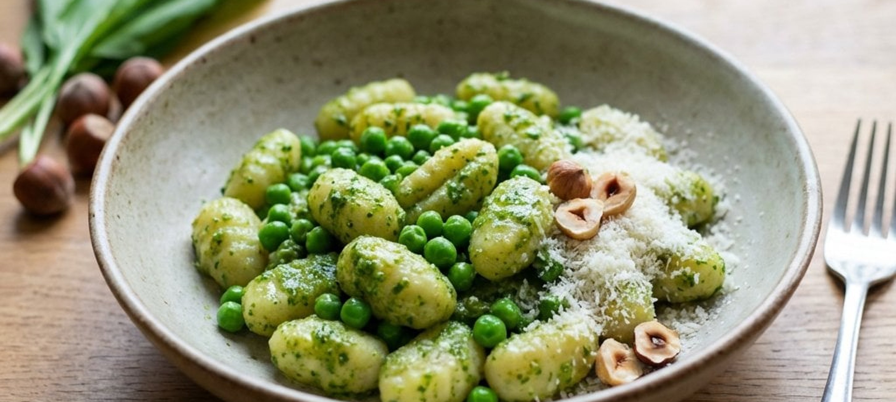 - 3Die fertigen Gnocchi abgießen und direkt mit ca. 4 EL des frischen Bärlauchpestos und den gebratenen Erbsen vermengen. Auf Tellern anrichten und nach Belieben mit zusätzlichem geriebenem Pecorino bestreuen. Das Pesto passt auch hervorragend zu Pasta, Risotto oder als Aufstrich auf Brot mit einem gekochten Ei.