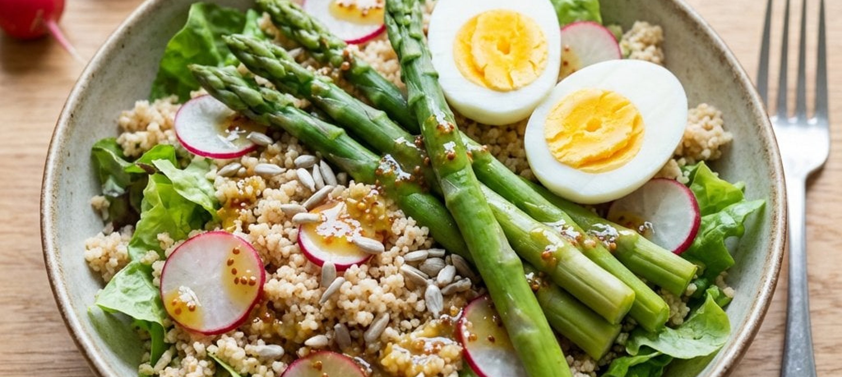 - 5Den Couscous mit dem Wildkräutersalat and den Radieschenscheiben vermengen. Auf Tellern anrichten, den blanchierten Spargel und die halbierten Eier darauf verteilen. Mit Sonnenblumenkernen bestreuen und großzügig mit dem Honig-Senf-Dressing beträufeln.